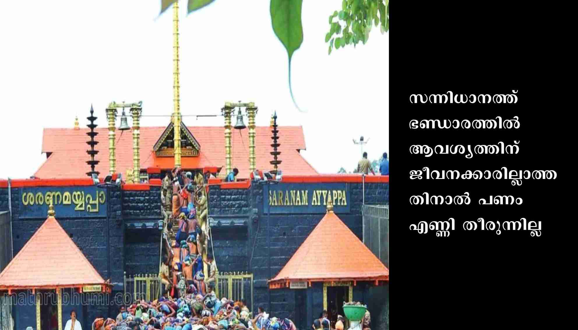 ശബരിമല: സന്നിധാനത്ത് ഭണ്ഡാരത്തില് ആവശ്യത്തിന് ജീവനക്കാരില്ലാത്തതിനാല് പണം എണ്ണി തീരുന്നില്ല. 141 ജീവനക്കാര് മാത്രമാണുള്ളത്. കുറഞ്ഞത് 200 പേരെങ്കിലും ഉണ്ടെങ്കിലെ അന്നന്ന് വരുന്ന പണം പൂര്ണമായി എണ്ണിത്തീരുകയുള്ളൂ. ശ്രീകോവിലിന് മുന്നിലെ ഹുണ്ടികയില് നിന്നും കണ്വയര് ബല്റ്റ് വഴി വരുന്ന പണവും ശബരീപീഠം മുതല് സന്നിധാനത്ത് വിവിധ ഭാഗങ്ങളില് സ്ഥാപിച്ചിരിക്കുന്ന 145 വഞ്ചികളിലേയും മഹാകാണിക്കയിലെയും പണവുമാണ് ഭണ്ഡാരത്തിലെത്തിച്ച് എണ്ണിത്തിട്ടപ്പെടുത്തി ബാങ്കിന് കൈമാറുന്നത്.