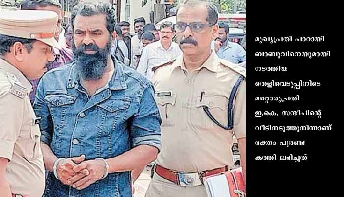 മുഖ്യപ്രതി പാറായി ബാബുവിനെയുമായി നടത്തിയ തെളിവെടുപ്പിനിടെ മറ്റൊരുപ്രതി ഇ.കെ. സന്ദീപിന്റെ വീടിനടുത്തുനിന്നാണ് രക്തം പുരണ്ട കത്തി ലഭിച്ചത്.