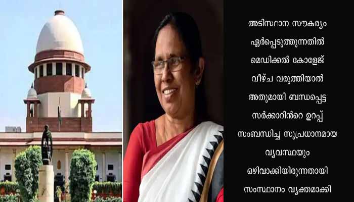 ദേശീയ മെഡിക്കല്‍ കമ്മീഷന്റെ മാനദണ്ഡങ്ങള്‍ പ്രകാരം അടിസ്ഥാന സൗകര്യങ്ങള്‍ ഏര്‍പ്പെടുത്തുന്നതില്‍ മെഡിക്കല്‍ കോളേജുകള്‍ വീഴ്ചവരുത്തിയാല്‍ സംസ്ഥാന സര്‍ക്കാര്‍ നല്‍കേണ്ട ഉറപ്പ് സംബന്ധിച്ച് എസന്‍ഷ്യാലിറ്റി സര്‍ട്ടിഫിക്കറ്റില്‍ രേഖപ്പെടുത്തണമെന്നാണ് വ്യവസ്ഥ. എന്നാല്‍ ചെര്‍പ്പുളശ്ശേരിയിലെ കേരളാ മെഡിക്കല്‍ കോളേജിന് ഈ വ്യവസ്ഥകള്‍ ഒഴിവാക്കിയാണ് സര്‍ക്കാര്‍ എസന്‍ഷ്യാലിറ്റി സര്‍ട്ടിഫിക്കറ്റ് നല്‍കിയത്. ഇതോടൊപ്പം മെഡിക്കല്‍ കോളേജ് ആരംഭിക്കുന്നതിനുള്ള ന്യായീകരണവും എസന്‍ഷ്യാലിറ്റി സര്‍ട്ടിഫിക്കറ്റില്‍ രേഖപ്പെടുത്തണം. ഈ വ്യവസ്ഥയും സര്‍ക്കാര്‍ ഒഴിവാക്കിയിരുന്നെന്നും സത്യവാങ്മൂലത്തില്‍ പറയുന്നു. എന്നാല്‍, വ്യവസ്ഥകള്‍ ഒഴിവാക്കി കോളേജിന് എസന്‍ഷ്യാലിറ്റി സര്‍ട്ടിഫിക്കറ്റ് നല്‍കിയെങ്കിലും മെഡിക്കല്‍ കോളേജ് ഇതുവരെയായും പ്രവര്‍ത്തനം ആരംഭിച്ചിട്ടില്ലെന്നും സര്‍ക്കാര്‍ സത്യവാങ്മൂലത്തില്‍ സുപ്രിം കോടതിയെ അറിയിച്ചു.