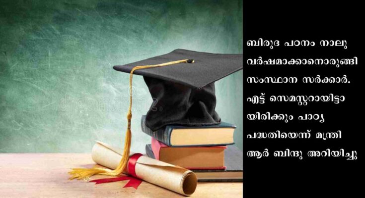 തിരുവനന്തപുരം: ബിരുദ പഠനം നാലു വര്ഷമാക്കാനൊരുങ്ങി സംസ്ഥാന സര്ക്കാര്. എട്ട് സെമസ്റ്ററായിട്ടായിരിക്കും പാഠ്യപദ്ധതിയെന്ന് മന്ത്രി ആര് ബിന്ദു അറിയിച്ചു. കരിക്കുലം കമ്മിറ്റി പരിഷ്ക്കരിക്കുന്നതിന്റെ ഭാഗമായാണിത്. ഉന്നത വിദ്യാഭ്യാസം ലക്ഷ്യമിടുന്നവര്ക്ക് നേരിട്ട് രണ്ടാംവര്ഷ പി ജിക്ക് ചേരാനുള്ള ക്രമീകരണമൊരുക്കുന്ന കാര്യവും ആലോചനയിലുണ്ട്. ഉന്നത വിദ്യാഭ്യാസ മേഖലയുമായി ബന്ധപ്പെട്ട കാര്യങ്ങള് പഠിക്കാന് നിയോഗിച്ച കമ്മീഷന് സമര്പ്പിച്ച റിപ്പോര്ട്ടിന്റെ അടിസ്ഥാനത്തിലാണ് കരിക്കുലം കമ്മിറ്റി പരിഷ്ക്കരിക്കാന് സര്ക്കാര് തീരുമാനിച്ചത്. നാളെ മുതല് തിരുവനന്തപുരത്ത് നടക്കുന്ന കരിക്കുലം പരിഷ്ക്കരണ ശില്പശാലയിലായിരിക്കും തീരുമാനം കൈക്കൊള്ളുക.