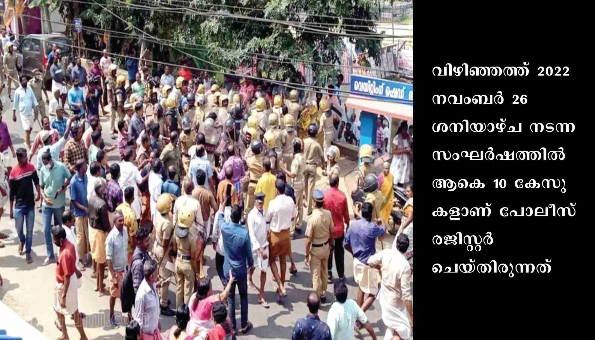 വിഴിഞ്ഞത്ത് 2022 നവംബർ 26 ശനിയാഴ്ച നടന്ന സംഘർഷത്തിൽ ആകെ 10 കേസുകളാണ് പോലീസ് രജിസ്റ്റർ ചെയ്തിരുന്നത്. ഇതിൽ തുറമുഖത്തെ അനുകൂലിക്കുന്നവരും എതിർക്കുന്നവരും തമ്മിലുള്ള സംഘർഷത്തിൽ ഒമ്പത് കേസുകളാണ് ലത്തീൻ സഭയുടെ നേതൃത്വത്തിലുള്ള തുറമുഖ വിരുദ്ധ സമരക്കാർക്കെതിരെ ചുമത്തിയിരിക്കുന്നത്.