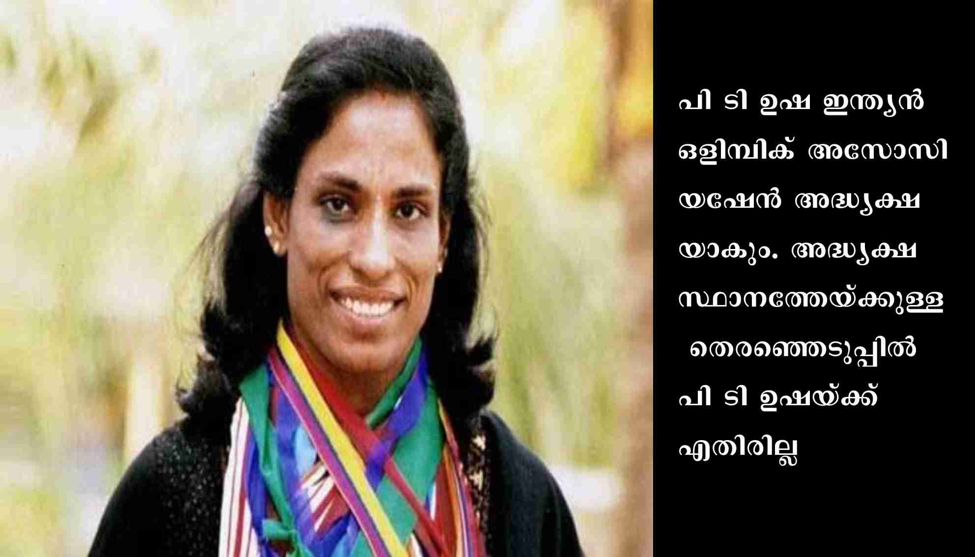 പി ടി ഉഷ ഇന്ത്യൻ ഒളിമ്പിക് അസോസിയഷേൻ അദ്ധ്യക്ഷയാകും. അദ്ധ്യക്ഷ സ്ഥാനത്തേയ്ക്കുള്ള തെരഞ്ഞെടുപ്പിൽ പി ടി ഉഷയ്ക്ക് എതിരില്ല. സീനിയർ വൈസ് പ്രസിഡന്റ്, വൈസ് പ്രസിഡന്റ്, ജോയിൻറ് സെക്രട്ടറി സ്ഥാനങ്ങളിലേക്കും ഒറ്റ പേരുകൾ മാത്രമാണുള്ളത്.പത്രിക സമർപ്പണത്തിനുള്ള സമയം അവസാനിച്ചപ്പോൾ പി ടി ഉഷക്ക് എതിരാളികളില്ല. തെരഞ്ഞെടുപ്പ് നിശ്ചയിച്ചിരുന്ന ഡിസംബർ 10 ന് ഔദ്യോഗിക പ്രഖ്യാപനം ഉണ്ടാകും.