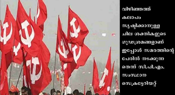 വിഴിഞ്ഞം പദ്ധതിയുമായി ബന്ധപ്പെട്ട് മത്സ്യത്തൊഴിലാളി മേഖലയില് നേരത്തേ ഉയര്ന്നുവന്ന ആശങ്കകളെല്ലാം ചര്ച്ചകളിലൂടെ പരിഹരിക്കുകയും സാധ്യമായ ഇടപെടലുകള് സംസ്ഥാന സര്ക്കാര് നടത്തിയിട്ടുള്ളതുമാണ്. ഇപ്പോള് സമരരംഗത്തുള്ള ചെറുവിഭാഗവുമായി ചര്ച്ച നടത്താനും പ്രശ്നം പരിഹരിക്കാനുമുള്ള നടപടികള് സ്വീകരിച്ചിട്ടുണ്ട്. ചില സ്ഥാപിത താല്പര്യങ്ങളാണ് ഇതിന് തടസമായി നിന്നതെന്നും സി.പി.എം. കുറ്റപ്പെടുത്തി.