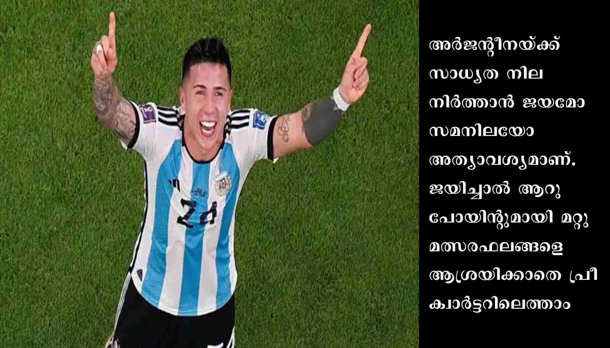 രണ്ട് കളികളിലായി നാല് പോയിന്റ് നേടിയ പോളണ്ട് ഒന്നാമതും മൂന്ന് പോയിന്റ് നേടിയ അര്ജന്റീന രണ്ടാമതുമാണ്. സൗദിക്കും അര്ജന്റീനയ്ക്കും മൂന്ന് പോയിന്റ് വീതമാണ്. പോളണ്ടിനെ തോല്പ്പിച്ചാല് അര്ജന്റീന ഒന്നാംസ്ഥാനക്കാരായി നോക്കൗട്ടിലെത്തും. സമനില നേടിയാലും പോളണ്ടിനു മുന്നേറാനാകും.നാല് ടീമുകള്ക്കും സാധ്യതയുണ്ട്. തോറ്റാല് അര്ജന്റീന പുറത്തേക്കും പോളണ്ട് പ്രീ ക്വാര്ട്ടറിലേക്കും പോകും. അര്ജന്റീനയ്ക്ക് സാധ്യത നിലനിര്ത്താന് ജയമോ സമനിലയോ അത്യാവശ്യമാണ്. ജയിച്ചാല് ആറു പോയിന്റുമായി മറ്റു മത്സരഫലങ്ങളെ ആശ്രയിക്കാതെ പ്രീ ക്വാര്ട്ടറിലെത്താം.