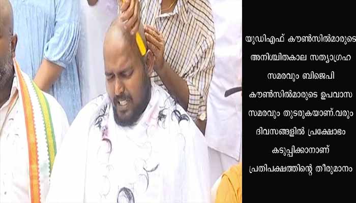 നഗരസഭയ്ക്ക് ചുറ്റും മണി കൊട്ടിയായിരുന്നു ബിജെപി കൗൺസിലർമാരുടെ പ്രതിഷേധം. യുഡിഎഫ് കൗൺസിൽമാരുടെ അനിശ്ചിതകാല സത്യാഗ്രഹം സമരവും ബിജെപി കൗൺസിൽമാരുടെ ഉപവാസ സമരവും തുടരുകയാണ്. വരും ദിവസങ്ങളിൾ പ്രക്ഷോഭം കടുപ്പിക്കാനാണ് പ്രതിപക്ഷത്തിന്റെ തീരുമാനം.