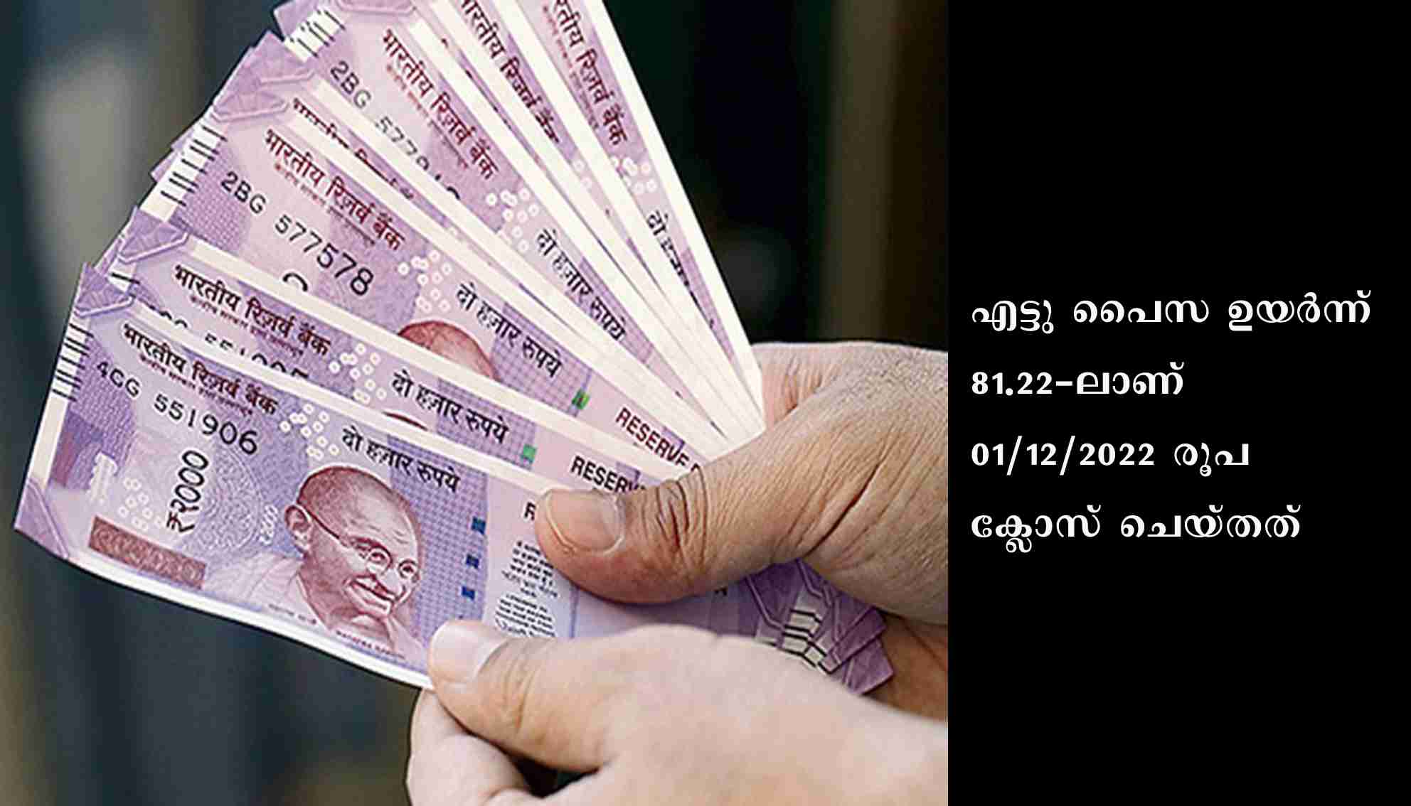 മുംബൈ: വിനിമയ വിപണിയില്‍ ഡോളറിനെതിരേ രൂപയ്ക്കു നേട്ടം. എട്ടു പൈസ ഉയര്‍ന്ന് 81.22-ലാണ് 01/12/2022 രൂപ ക്ലോസ് ചെയ്തത്. അവസാന കണക്കില്‍ നേരിയ വ്യതിയാനത്തിനു സാധ്യതയുണ്ട്. ബുധനാഴ്ച ഡോളറിനെതിരേ രൂപയുടെ മൂല്യം 81.30 എന്ന നിലയിലാണു ക്ലോസ് ചെയ്തത്.