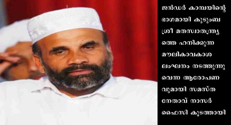 കോഴിക്കോട്: ജൻഡർ കാമ്പയിന്റെ ഭാഗമായി കുടുംബശ്രീ മതസ്വാതന്ത്ര്യത്തെ ഹനിക്കുന്ന മൗലികാവകാശ ലംഘനം നടത്തുന്നുവെന്ന ആരോപണവുമായി സമസ്ത നേതാവ് നാസർ ഫൈസി കൂടത്തായി. കാമ്പയിന്റെ ഭാഗമായി കുടുംബശ്രീ എടുപ്പിക്കുന്ന പ്രതിജ്ഞയിൽ പെൺമക്കൾക്കും ആൺമക്കൾക്കും തുല്യ സ്വത്തവകാശം നൽകുമെന്ന വാചകമാണ് സമസ്ത നേതാവ് ചൂണ്ടിക്കാട്ടുന്നത്.സമസ്തയുടെ യുവജന വിഭാഗമായ എസ് വൈ എസിന്റെ സംസ്ഥാന സെക്രട്ടറിയാണ് നാസർ ഫൈസി കൂടത്തായി. ഫെയ്സ്ബുക്കിലൂടെയാണ് അദ്ദേഹത്തിന്റെ പ്രതികരണം.