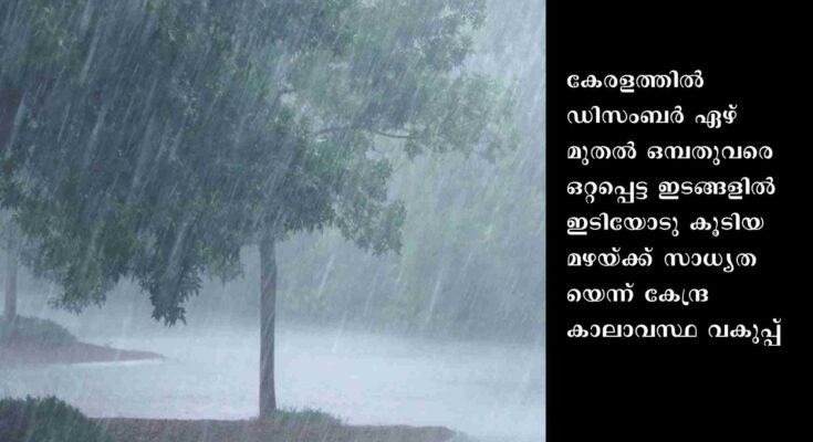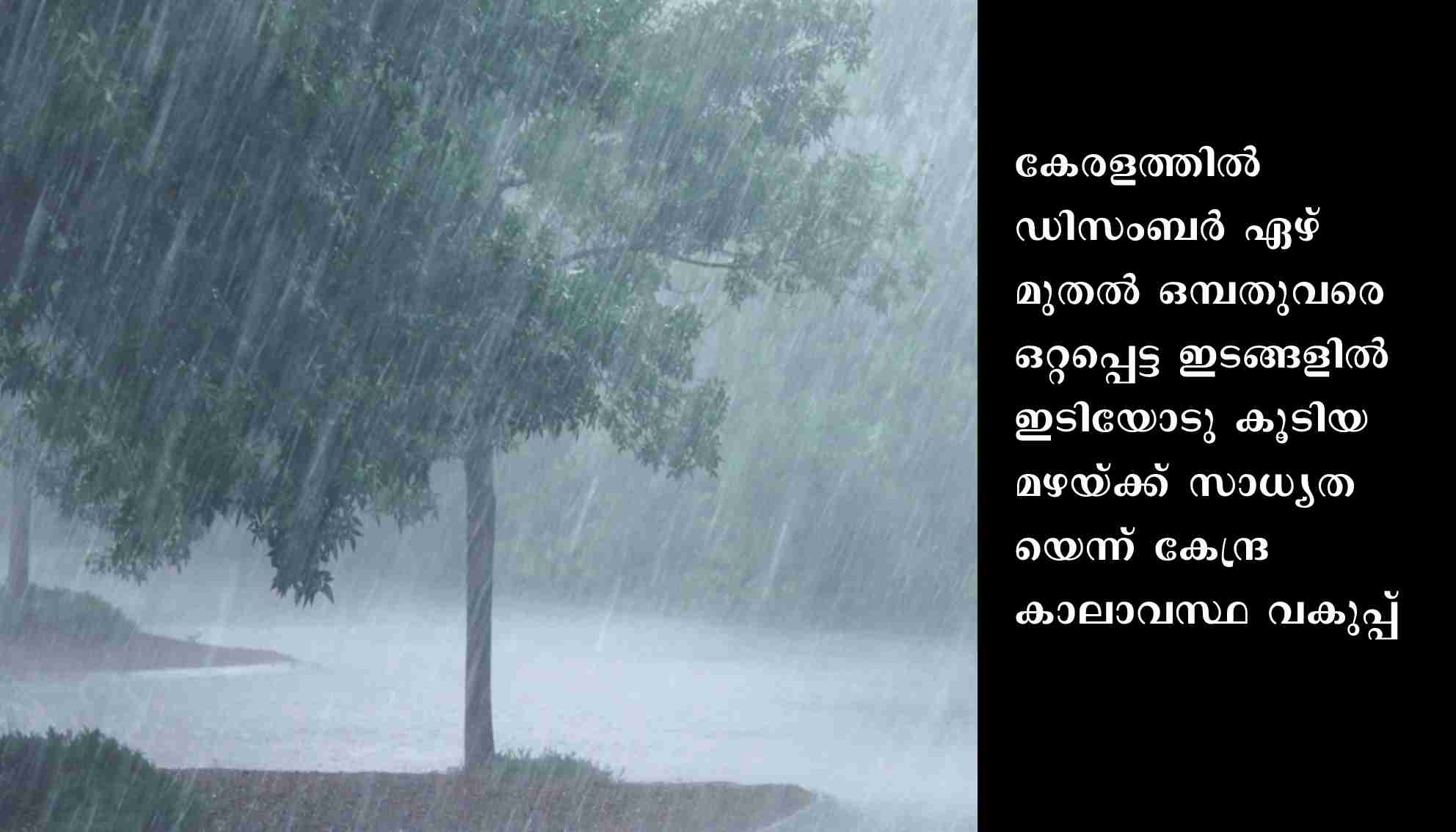 തിരുവനന്തപുരം: കേരളത്തില് ഡിസംബര് ഏഴ് മുതല് ഒമ്പതുവരെ ഒറ്റപ്പെട്ട ഇടങ്ങളില് ഇടിയോടു കൂടിയ മഴയ്ക്ക് സാധ്യതയെന്ന് കേന്ദ്ര കാലാവസ്ഥ വകുപ്പ്. കാര്മേഘം കണ്ട് തുടങ്ങുന്ന സമയം മുതല് തന്നെ മുന്കരുതല് സ്വീകരിക്കണമെന്നും ഇടിമിന്നല് ദൃശ്യമല്ല എന്നതിനാല് ഇത്തരം മുന്കരുതല് സ്വീകരിക്കുന്നതില് നിന്നും വിട്ടുനില്ക്കരുതെന്നും സംസ്ഥാന ദുരന്തനിവാരണ അതോറിറ്റി നിര്ദേശിച്ചു.ഇടിമിന്നല് ലക്ഷണം കണ്ടാല് തുറസായസ്ഥലങ്ങളില് നില്ക്കുന്നത് ഒഴിവാക്കണം. ജനലും വാതിലും അടച്ചിടണം. ഗൃഹോപകരണങ്ങളുടെ വൈദ്യുതി ബന്ധം വിച്ഛേദിക്കണം. വൈദ്യുതി ഉപകരണങ്ങളുമായുള്ള സാമിപ്യം ഒഴിവാക്കണം.ഇടിമിന്നല് സമയത്ത് ടെറസിലോ ഉയരമുള്ള സ്ഥലങ്ങളിലോ വൃക്ഷക്കൊമ്പിലോ ഇരിക്കുന്നത് അപകടകരമാണ്. പട്ടം പറത്തുന്നത് ഒഴിവാക്കണം.അന്തരീക്ഷം മേഘാവൃതമാണെങ്കില്, തുറസായ സ്ഥലത്തും, ടെറസ്സിലും കുട്ടികളെ കളിക്കാന് അനുവദിക്കരുത്.മിന്നലാഘാതമേറ്റ ആളിന്റെ ശരീരത്തില് വൈദ്യുത പ്രവാഹം ഉണ്ടാകില്ല. മിന്നലേറ്റ ആളിന് ഉടന് വൈദ്യ സഹായം എത്തിക്കണം.