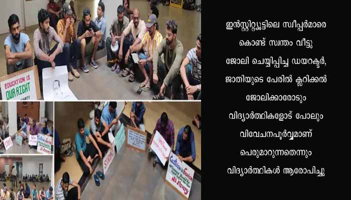 സ്ഥാപനത്തിലെ ജോലിക്ക് ശേഷം വീട്ട് ജോലിക്കെത്തിയില്ലെങ്കില് പിരിച്ചുവിടുമെന്നാണ് സ്വീപ്പര്മാരെ അറിയിച്ചത്. വീടിന് പുറത്തെ ശുചിമുറിയില് നിന്ന് കുളിച്ചതിന് ശേഷം മാത്രമേ ഇവരോട് ഡയറക്ടറുടെ വീട്ടില് കയറാന് പാടുള്ളൂവെന്നും നിര്ദ്ദേശമുണ്ട്.2022 ഫെബ്രുവരിയിലാണ് 32 കാരിയായ പരാതിക്കാരിയടക്കം മൂന്ന് പേരെ ദിവസവേതനത്തില് കെ ആര് നാരായണന് ഇന്സ്റ്റിറ്റ്യൂട്ട് ഓഫ് വിഷ്വല് സയന്സില് സ്വീപ്പര് ജോലിക്കെടുത്തത്. ഇന്സ്റ്റിറ്റ്യൂട്ട് ഡയറക്ടര് ശങ്കര് മോഹന്റെ നേതൃത്വത്തില് വിദ്യാര്ത്ഥികളോടും സ്റ്റാഫിനോടും ജാതീയമായ വിവേചനങ്ങള് നടക്കുന്നെന്നും വിദ്യാര്ത്ഥികള് ആരോപിച്ചു. കൂടാതെ 6.11.2021 ല് ഉന്നത വിദ്യാഭ്യാസ രംഗത്ത് സംസ്ഥാന സര്ക്കാറിന്റെ നിയന്ത്രണത്തിലുള്ള പൊതുമേഖലാ സ്ഥാപനങ്ങളില് നിയമിക്കപ്പെടുന്ന മാനേജിംഗ് ഡയറക്ടര്മാരുടെ ഉയര്ന്ന പ്രായപരിധി 65 ആയി നിജപ്പെടുത്തിയിട്ടും പ്രസ്തുത ഉത്തരവ് മുക്കിക്കളഞ്ഞ ഡയറക്ടര് 68 -ാമത്തെ വയസിലും ഇന്സ്റ്റിറ്റ്യൂട്ട് ഡയറക്ടറായി തുടരുകയാണെന്നും ഇത് സര്ക്കാര് ഉത്തരവിന്റെ നഗ്നമായ ലംഘനമാണെന്നും വിദ്യാര്ത്ഥികള് ആരോപിച്ചു.