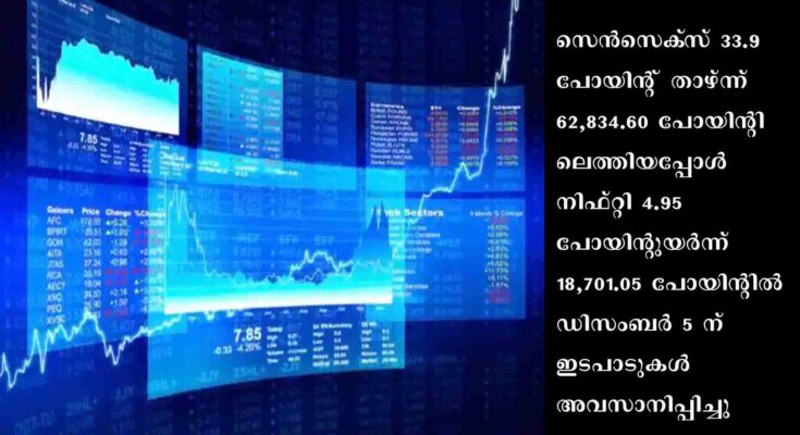 മുംബൈ: ഓഹരിവിപണികളില്‍ ആഴ്ചയിലെ ആദ്യവ്യാപാരദിനം ചാഞ്ചാട്ടം. ബോംബെ സെന്‍സെക്‌സ് നേരിയ നഷ്ടം രേഖപ്പെടുത്തിയപ്പോള്‍ ദേശീയ ഓഹരി സൂചികയായ നിഫ്റ്റി 0.03 ശതമാനത്തിന്റെ നേട്ടം കൈവരിച്ചു. സെന്‍സെക്‌സ് 33.9 പോയിന്റ് താഴ്ന്ന് 62,834.60 പോയിന്റിലെത്തിയപ്പോള്‍ നിഫ്റ്റി 4.95 പോയിന്റുയര്‍ന്ന് 18,701.05 പോയിന്റില്‍ ഡിസംബർ 5 ന് ഇടപാടുകള്‍ അവസാനിപ്പിച്ചു.