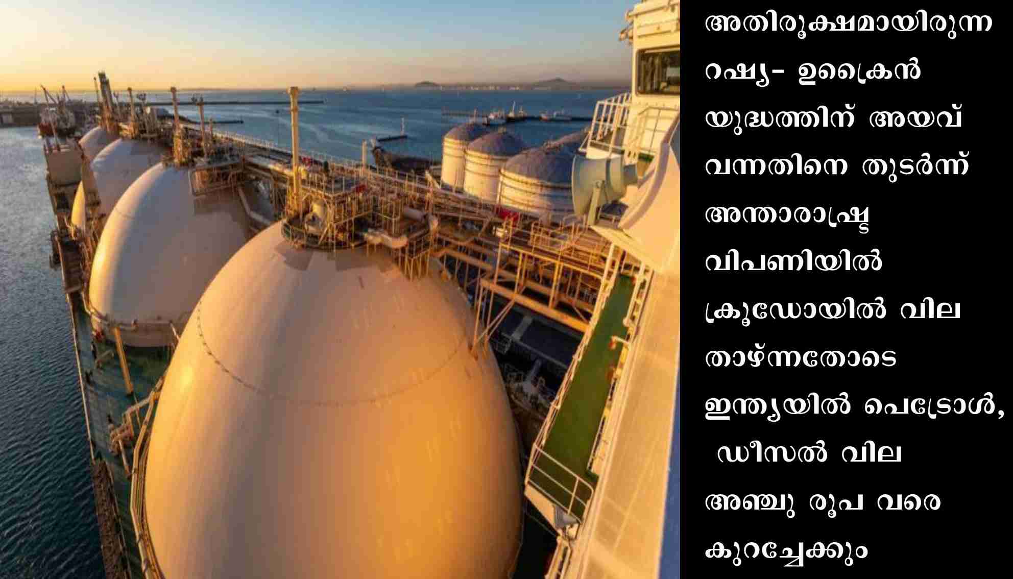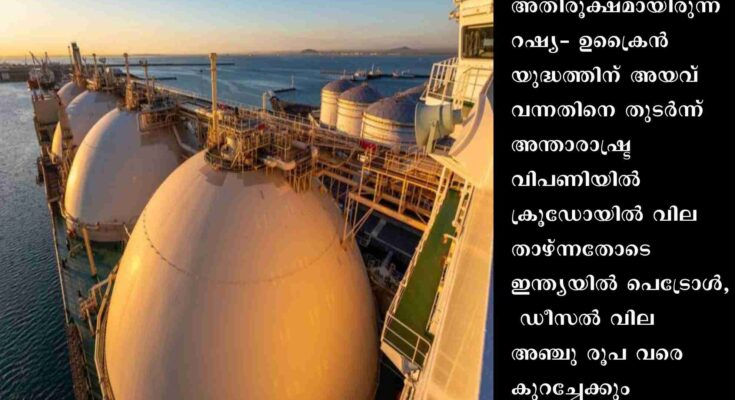 തിരുവനന്തപുരം: അതിരൂക്ഷമായിരുന്ന റഷ്യ- ഉക്രൈൻ യുദ്ധത്തിന് അയവ് വന്നതിനെ തുടർന്ന് അന്താരാഷ്ട്ര വിപണിയിൽ ക്രൂഡോയിൽ വില താഴ്ന്നതോടെ ഇന്ത്യയിൽ പെട്രോൾ, ഡീസൽ വില അഞ്ചു രൂപ വരെ കുറച്ചേക്കും. ഡിസംബറിൽ തീരുമാനം ഉണ്ടാകുമെന്ന് സൂചന. ക്രൂഡോയിൽ വില ബാരലിന് 120 ഡോളറിൽ നിന്ന് 90 ആയാണ് കുറഞ്ഞത്. കഴിഞ്ഞ ഒരു മാസമായി ഇതേ രീതിയിൽ തുടരുന്ന ക്രൂഡോയിൽ വില ഇനിയും കുറയുമെന്നും സൂചനയുണ്ട്.