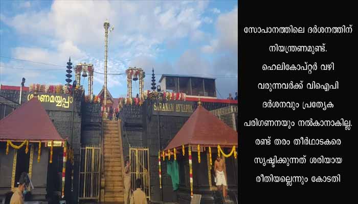 പത്തനംതിട്ട : ശബരിമലയിൽ സ്വകാര്യ കമ്പനി ഹെലികോപ്റ്ററടക്കം വിഐപി ദർശനം വാഗ്ദാനം ചെയ്ത സംഭവത്തിൽ ഇടപെട്ട് ഹൈക്കോടതി. ശബരിമലയിൽ രണ്ട് തരം തീർഥാടകരെ സൃഷ്ടിക്കാനാകില്ലെന്ന് ഹൈക്കോടതി വ്യക്തമാക്കി. സോപാനത്തിലെ ദർശനത്തിന് നിയന്ത്രണമുണ്ട്. ഹെലികോപ്റ്റർ വഴി വരുന്നവർക്ക് വിഐപി ദർശനവും പ്രത്യേക പരിഗണനയും നൽകാനാകില്ല. രണ്ട് തരം തീർഥാടകരെ സൃഷ്ടിക്കുന്നത് ശരിയായ രീതിയല്ലെന്നും കോടതി നിരീക്ഷിച്ചു. നിലക്കലിൽ സജീകരിച്ച ഹെലിപ്പാട് താൽക്കാലിക സംവിധാനം മാത്രമാണെന്നും കോടതി വ്യക്തമാക്കി. കേസ് 06/12/22 ചൊവ്വാഴ്ച ഉച്ചയ്ക്ക് 2 മണിക്ക് ഹൈക്കോടതി വീണ്ടും പരിഗണിക്കും.