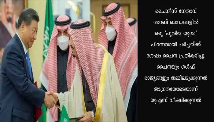 ചൈനീസ് നേതാവ് അറബ് ബന്ധങ്ങളിൽ ഒരു ‘പുതിയ യുഗം’ പിറന്നതായി ചർച്ചയ്ക്ക് ശേഷം ചൈന പ്രതികരിച്ചു. ചൈനയും ഗൾഫ് രാജ്യങ്ങളും തമ്മിലടുക്കുന്നത് ജാഗ്രതയോടെയാണ് യുഎസ് വീക്ഷിക്കുന്നത്. ഊർജ നയത്തിൽ യുഎസുമായുള്ള സൗദി ബന്ധം ഉലയുന്നതിനിടെയാണ് ചൈനീസ് പ്രസിഡന്റിന്റെ സന്ദർശനമെന്നത് ശ്രദ്ധേയമാണ്. സൗദി കിരീടാവകാശിയുമായി ചൈനീസ് പ്രസിഡന്റ് വിശദമായ ചർച്ച നടത്തി.