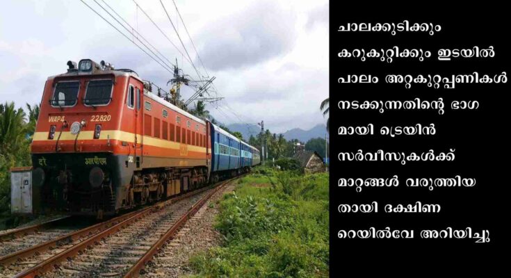 ട്രെയിന് നമ്പര് 16307 ആലപ്പുഴ- കണ്ണൂര് എക്സ്പ്രസ് ആലപ്പുഴക്കും ഷൊര്ണ്ണൂര് ജംഗ്ഷനുമിടയിലും ട്രെയിന് നമ്പര്.16308 കണ്ണൂര്- ആലപ്പുഴ എക്സ്പ്രസ് ഷൊര്ണ്ണൂരിലും ആലപ്പുഴക്കുമിടയിലും ട്രെയിന് നമ്പര് 16649 മംഗളൂരു ജംഗ്ഷന്- നാഗര്കോവില് പരശുറാം എക്സ്പ്രസ് ഷൊര്ണ്ണൂരിലും നാഗര്കോവിലിലും ഇടയിലും ട്രെയിന് നമ്പര്.16650 നാഗര്കോവില്- മംഗലാപുരം സെന്ട്രല് പരശുറാം എക്സ്പ്രസ് നാഗര്കോവിലും ഷൊര്ണ്ണൂര് ജംഗ്ഷനുമിടയിലും ട്രെയിന് നമ്പര് 22113 മുംബൈ ലോകമാന്യ തിലക്- കൊച്ചുവേളി തൃശ്ശൂരിനും -കൊച്ചുവേളിക്കും ഇടയിലും ട്രെയിന് നമ്പര് 22114 കൊച്ചുവേളി- മുംബൈ ലോകമാന്യ തിലക് കൊച്ചുവേളിക്കും തൃശ്ശൂരിനും ഇടയിലും ട്രെയിന് നമ്പര് 16301 ഷൊര്ണൂര് ജംഗ്ഷന്- തിരുവനന്തപുരം വേണാട് എക്സ്പ്രസ് ഷൊര്ണൂര് ജംഗ്ഷനും എറണാകുളം ജംക്ഷനും ഇടയിലും ട്രെയിന് നമ്പര്.16302 തിരുവനന്തപുരം- ഷൊര്ണൂര് ജംഗ്ഷന് വേണാട് എക്സ്പ്രസ് എറണാകുളം ജംഗ്ഷനും ഷൊര്ണൂര് ജംഗ്ഷനിലും ഇടയിലും ട്രെയിന് നമ്പര് 12076 തിരുവനന്തപുരം- കോഴിക്കോട് ജനുവരി ശതാബ്ദി എക്സപ്രസ് ആലുവയ്ക്കും കോഴിക്കോടിനും ഇടയിലും ട്രെയിന് നമ്പര് 12075 കോഴിക്കോട്- തിരുവനന്തപുരം ജനുവരി ശതാബ്ദി എക്സ്പ്രസ് കോഴിക്കോടിനും ആലുവക്കും ഇടയിലും ട്രെയിന് നമ്പര്. 16306 കണ്ണൂര് എറണാകുളം ജംഗ്ഷന് ഇന്റര്സിറ്റി ഷൊര്ണൂര് ജംക്ഷനും എറണാകുളം ജംഗ്ഷനും ഇടയിലും ട്രെയിന് നമ്പര് 12677 ബെംഗളൂരു- എറണാകുളം ഇന്റര്സിറ്റി തൃശ്ശൂരിനും എറണാകുളത്തിനും ഇടയിലും ഭാഗികമായി റദ്ദാക്കി.
