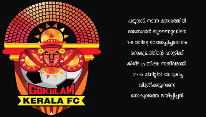 പയ്യനാട്: ഐ ലീഗ് ഫുട്ബോളില് നിലവിലെ ചാമ്പ്യന് ഗോകുലം കേരള എഫ്.സി. രണ്ടാം സ്ഥാനത്ത്. പയ്യനാട് നടന്ന മത്സരത്തില് രാജസ്ഥാന് യുണൈറ്റഡിനെ 1-0 ത്തിനു തോല്പ്പിച്ചതോടെ ഗോകുലത്തിന്റെ ഹാട്രിക്ക് കിരീട പ്രതീക്ഷ സജീവമായി. 51-ാം മിനിറ്റില് ഗോളടിച്ച വി. ശ്രീക്കുട്ടനാണു ഗോകുലത്തെ ജയിപ്പിച്ചത്.