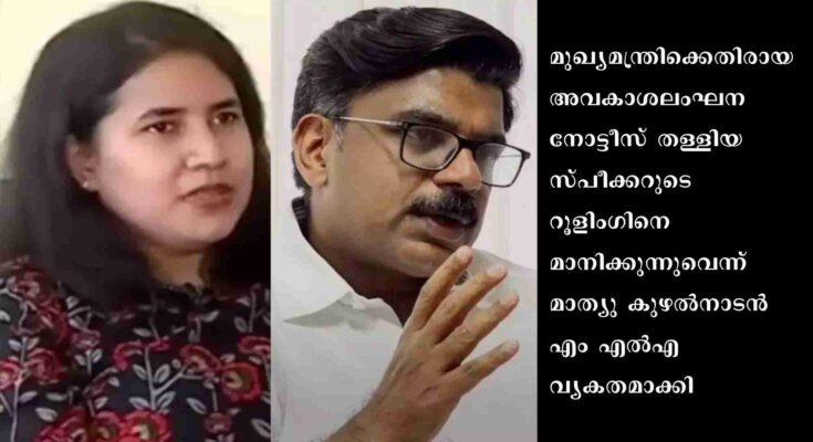 മൂവാറ്റുപുഴ: മുഖ്യമന്ത്രിക്കെതിരായ അവകാശലംഘന നോട്ടീസ് തള്ളിയ സ്പീക്കറുടെ റൂളിംഗിനെ മാനിക്കുന്നുവെന്ന് മാത്യു കുഴല്‍നാടന്‍ എം എല്‍എ വ്യകതമാക്കി. നോട്ടീസിന്റെ മറുപടിയിലൂടെ തന്റെ മകളുടെ കമ്പനിയുടെ മെന്ററായിരുന്നു ജയ്ക് ബാലകുമാർ എന്ന കാര്യം മുഖ്യമന്ത്രി അംഗീകരിച്ചിരിക്കുന്നു. വീണ വിജയനെ വ്യക്തിയെന്ന നിലയിൽ അല്ല എക്സ്ട്രാ ലോജിക്കിന്റെ ഡയറക്ടർ എന്ന നിലയിലാണ് അന്ന് പരാമർശം നടത്തിയത്. അന്ന് പറഞ്ഞ കാര്യം മുഖ്യമന്ത്രി അംഗീകരിച്ചിരിക്കുന്നു. പറഞ്ഞതിൽ ഉറച്ചുനിൽക്കുന്നു. സ്പീക്കറുടെ റൂളിംഗ് അംഗീകരിക്കുന്നു. ഇനി പരാതിയുമായി മുന്നോട്ടു പോകുന്നില്ല.