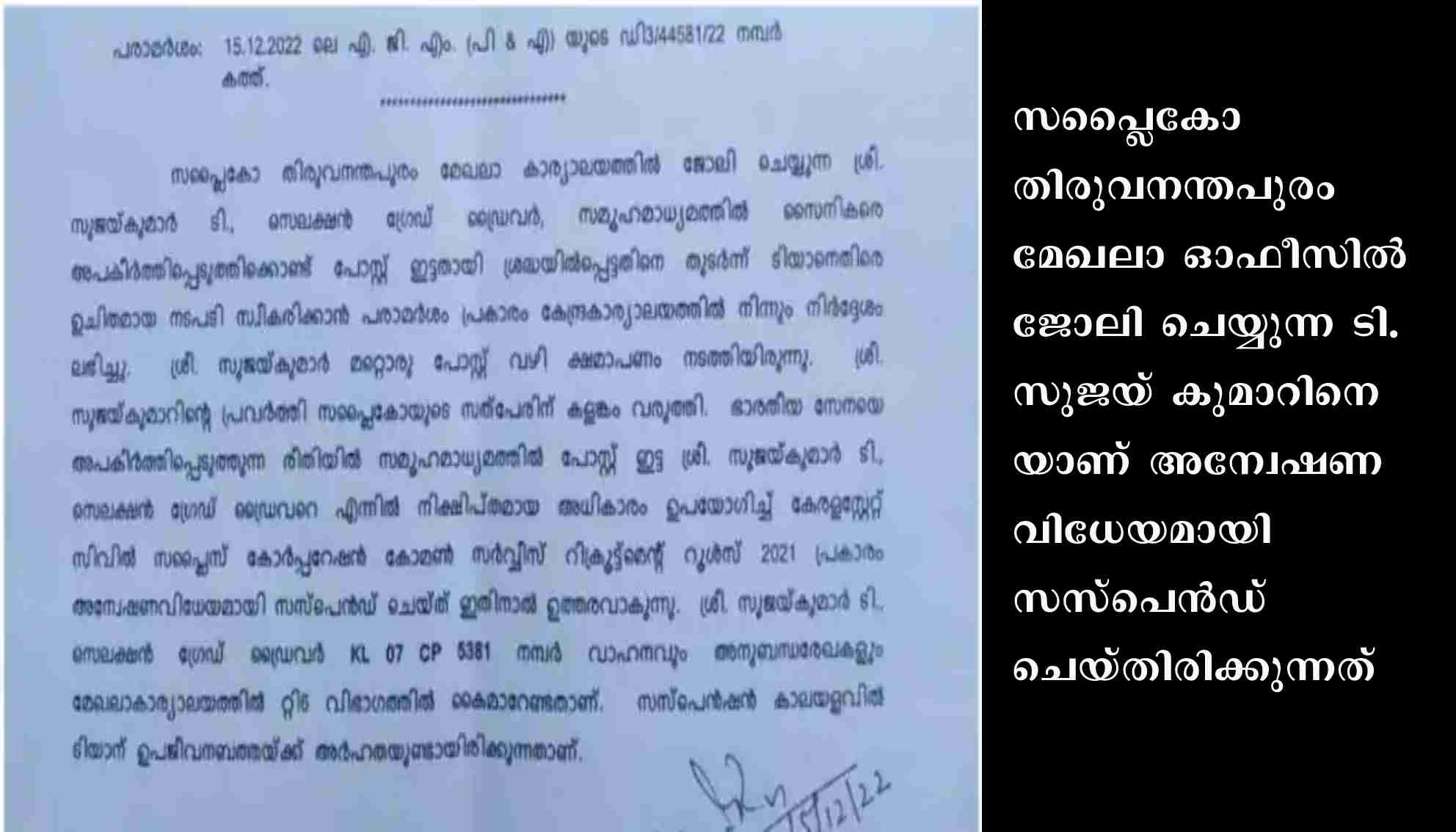 സുജയ് കുമാര് ഔദ്ധ്യോഗിക കാലയളവില് ഉപയോഗിച്ച കെഎൽസിപി 5381 നമ്പർ വാഹനവും, അനുബന്ധ രേഖകളും മേഖലാ കാര്യാലയത്തിൽ റ്റി 6 വിഭാഗത്തിൽ ഏൽപ്പിക്കണമെന്നും സപ്ലൈകോയുടെ ഉത്തരവിൽ വ്യക്തമാക്കുന്നു. അതേസമയം സസ്പെൻഷൻ കാലയളവിൽ സുജയ് കുമാറിന് ഉപജീവനബത്ത നൽകുമെന്നും ഉത്തരവില് പറയുന്നു. 15/12/22 വ്യാഴാഴ്ചയാണ് സുജയ്കുമാറിനെ സസ്പെൻഡ് ചെയ്ത്. സപ്ലൈകോ ഉത്തരവ് ഇറക്കിയത്. നാല് ആഴ്ച മുമ്പാണ് സുജയ് കുമാർ മറ്റൊരാളുടെ ഫേസ്ബുക്ക് പോസ്റ്റിനടിയിൽ സൈനികരെ അപമാനിച്ചു കൊണ്ട് കമന്റിട്ടത്.