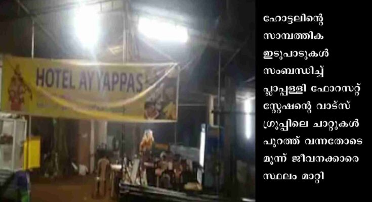 സർക്കാർ ഉദ്യോഗസ്ഥർ ലാഭേച്ഛയോടെ മറ്റ് തൊഴിലുകളിലേർപ്പെടരുതെന്ന സർവീസ് ചട്ടം മറികടന്നാണ് പ്ലാപ്പള്ളി സ്റ്റേഷനിലെ വനപാലകരുടെ കച്ചവടം. ഫോറസ്റ്റ് സ്റ്റേഷനോട് ചേർന്നുള്ള വനം വകുപ്പ് ഭൂമിയിലാണ് ഹോട്ടൽ പ്രവർത്തിക്കുന്നത്. ഫോറസ്റ്റ് സ്റ്റേഷന്റെ വാട്സ് ഗ്രൂപ്പിലെ ചാറ്റുകൾ പ്രകാരം 14 ജീവനക്കാരുടെ പങ്കാളിത്തത്തോടെയാണ് ഹോട്ടൽ തുടങ്ങിയിരിക്കുന്നത്. ദേവസ്വം ബോർഡിന്റെ കുത്തക ലേലം വിഞ്ജാപനം വന്നത് മുതൽ കട ഉദ്ഘാടനം വരെയുള്ള എല്ലാ വിവരങ്ങളും വാട്സ് അപ്പ് ഗ്രൂപ്പിലുണ്ട്. തിരുവല്ല സ്വദേശിക്ക് കാരാർ കൊടുത്തുകൊണ്ടുള്ള ദേവസ്വം ബോർഡിന്റെ സാക്ഷ്യപത്രം വനപാലകർ ഗ്രൂപ്പിൽ പങ്ക് വച്ചത് നമ്മുടെ കട ഓകെ ആയെന്ന സന്ദേശത്തോടെ. ഡെപ്യൂട്ടി റെയിഞ്ച് ഫോറസ്റ്റ് ഓഫീസറാണ് 2022 നവംബർ 11 ന് കടയുടെ കുറ്റിയടിക്കൽ കർമ്മം നിർവഹിച്ചിരിക്കുന്നത്.