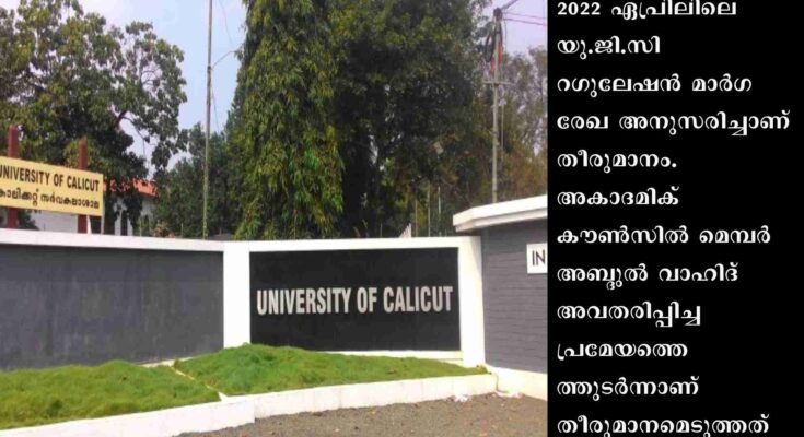തേഞ്ഞിപ്പലം: കാലിക്കറ്റ് സര്വകലാശാലയില് ഇരട്ട ബിരുദം പഠിക്കാന് അവസരം നല്കാന് 15/12/2022 ചേര്ന്ന അക്കാദമിക് കൗണ്സില് യോഗത്തില് തീരുമാനം. 2022 ഏപ്രിലിലെ യു.ജി.സി റഗുലേഷന് മാര്ഗരേഖ അനുസരിച്ചാണ് തീരുമാനം. അകാദമിക് കൗണ്സില് മെമ്പര് അബ്ദുല് വാഹിദ് അവതരിപ്പിച്ച പ്രമേയത്തെത്തുടര്ന്നാണ് തീരുമാനമെടുത്തത്. അക്കാദമിക ഗവേഷണങ്ങള് പ്രോത്സാഹിപ്പിക്കുന്നതിനായി അഫിലിയേറ്റഡ് കോളജുകളുടെ ഗവേഷണകേന്ദ്രങ്ങളില് ഗവേഷണം നടത്തുന്ന വിദ്യാര്ഥികള്ക്ക് ഫെലോഷിപ്പ് ഏര്പ്പെടുത്തും.