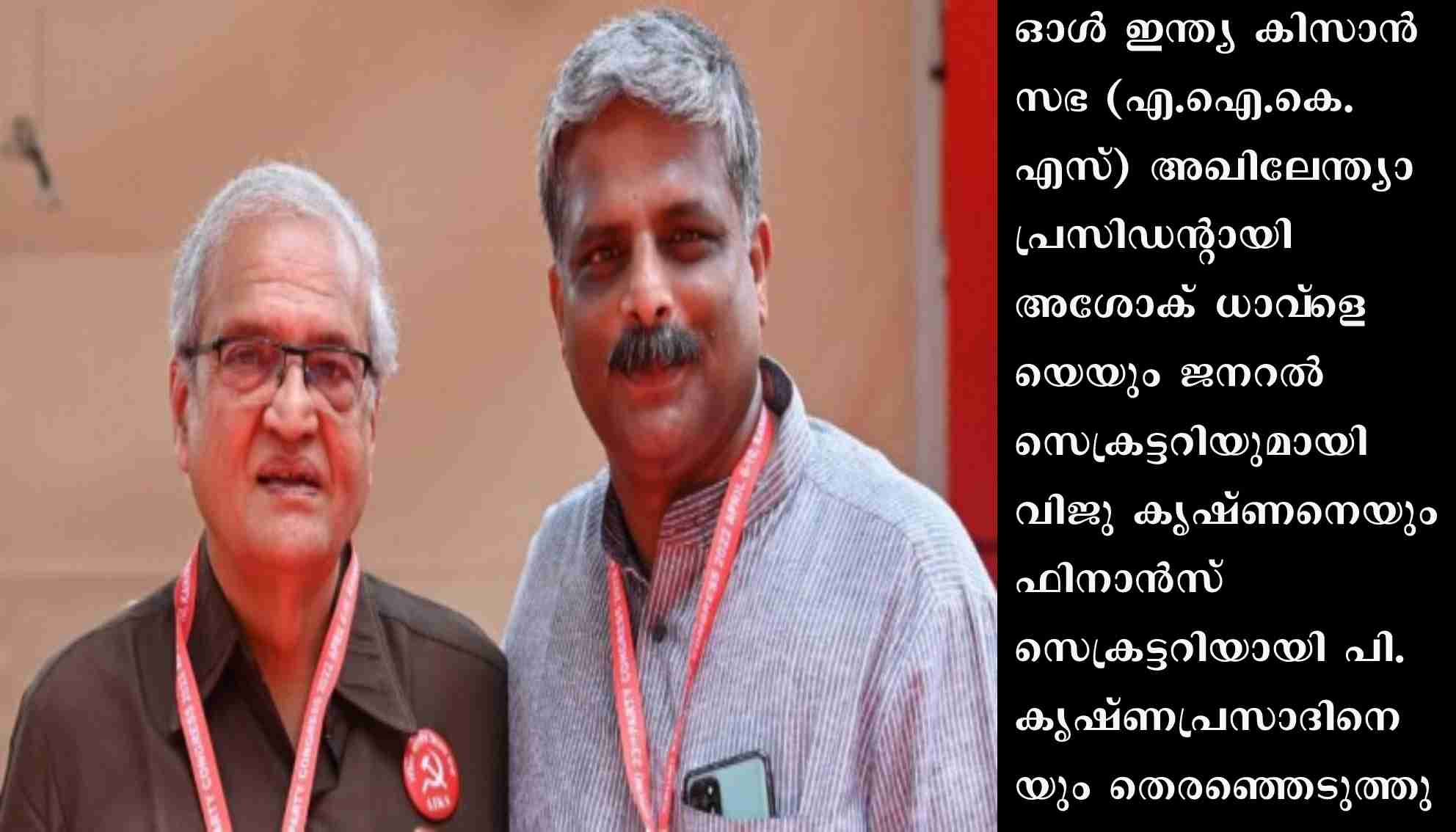 തൃശൂര്: ഓള് ഇന്ത്യ കിസാന് സഭ (എ.ഐ.കെ.എസ്) അഖിലേന്ത്യാ പ്രസിഡന്റായി അശോക് ധാവ്ളെയെയും ജനറല് സെക്രട്ടറിയുമായി വിജു കൃഷ്ണനെയും ഫിനാന്സ് സെക്രട്ടറിയായി പി. കൃഷ്ണപ്രസാദിനെയും തെരഞ്ഞെടുത്തു. കേരളത്തില് നിന്ന് കേന്ദ്ര കൗണ്സിലിലേക്ക് ഒന്പതുപേരെ തെരഞ്ഞെടുത്തിട്ടുണ്ട്. ഇ.പി. ജയരാജന്, എം. വിജയകുമാര്, കെ.എന്. ബാലഗോപാല്, കെ.കെ. രാഗേഷ്, വത്സന് പാനോളി, എന്. പ്രകാശന്, ഗോപി കോട്ടമുറിക്കല്, ഓമല്ലൂര് ശങ്കരന്, എം. സ്വരാജ് എന്നിവരെയാണ് തെരഞ്ഞെടുത്തത്.