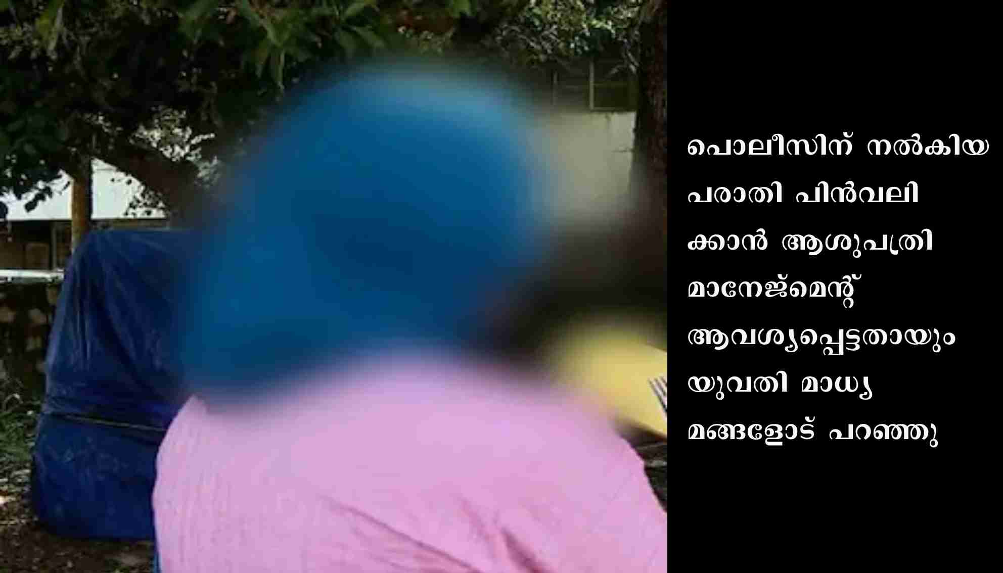 കോഴിക്കോട് പയ്യോളിയിലെ സ്വകാര്യ ആശുപത്രിയിൽ പി ആർ ഓ ആയ യുവതി മാനേജർ ഷഫീറിന്റെ മോശം പെരുമാറ്റത്തിനിതെരെ ആശുപത്രി മാനേജ്മെൻറിനാണ് ആദ്യം പരാതി നൽകിയത്. പലവട്ടം മാനേജരുടെ ഭാഗത്തു നിന്നും മോശം പെരുമാറ്റമുണ്ടായതായി യുവതി പറയുന്നു. മാനേജർക്കെതിരെ നടപടി സ്വീകരിക്കുന്നതിന് പകരം പരാതിക്കാരിക്കെതിരെ മാനേജ്മെന്റ് നടപടി സ്വീകരിച്ചെന്നാണ് ആക്ഷേപം. ട്രെയിനി സ്റ്റാഫെന്ന നിലയിൽ സ്ഥാപനത്തിനെതിരായ പ്രവർത്തനമുണ്ടായതിനാൽ സ്വമേധയാ പിരിഞ്ഞു പോകണമെന്നാവശ്യപ്പെട്ട് മാനേജ്മെൻറ് പരാതിക്കാരിക്ക് കത്ത് നൽകി.