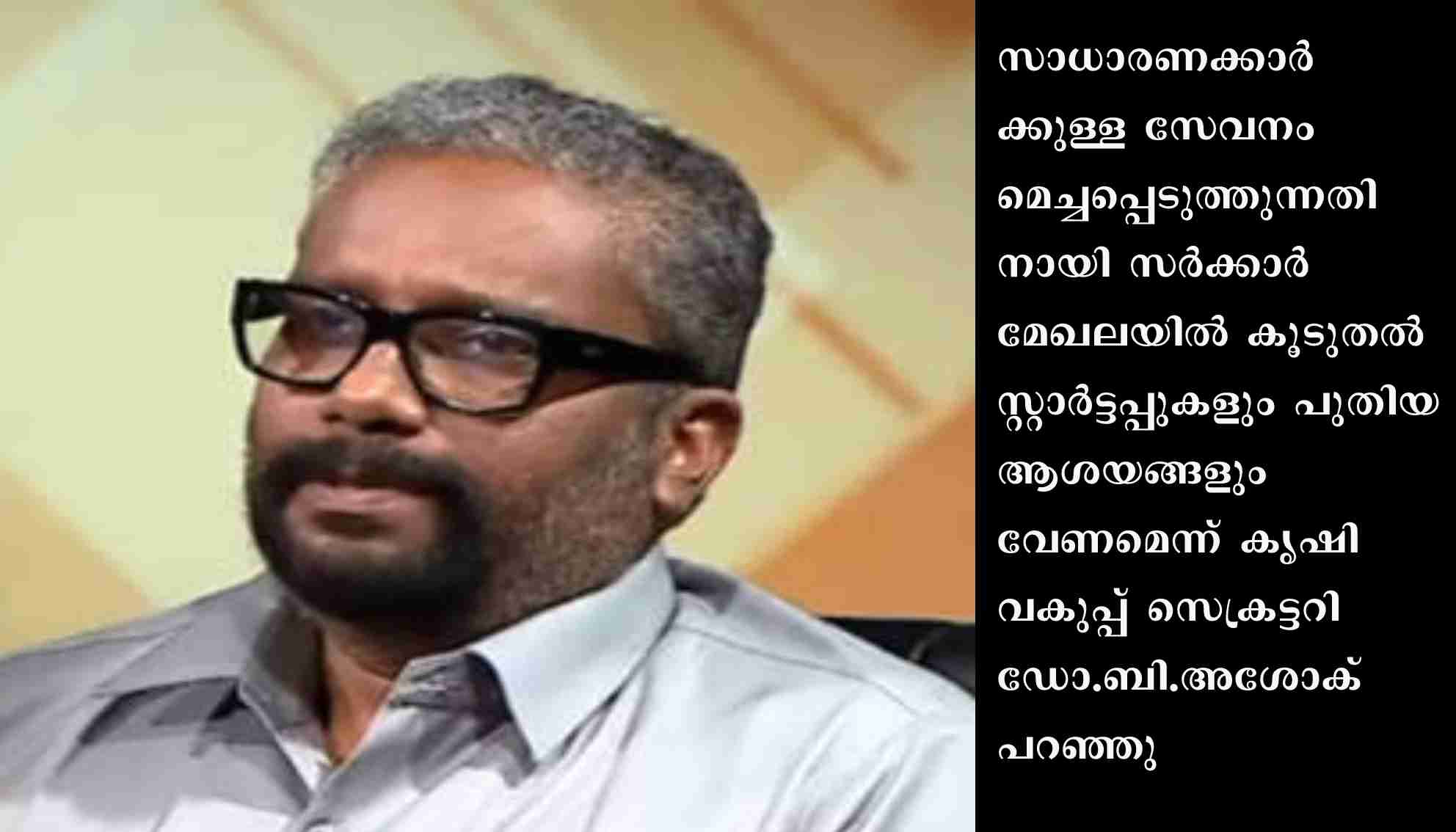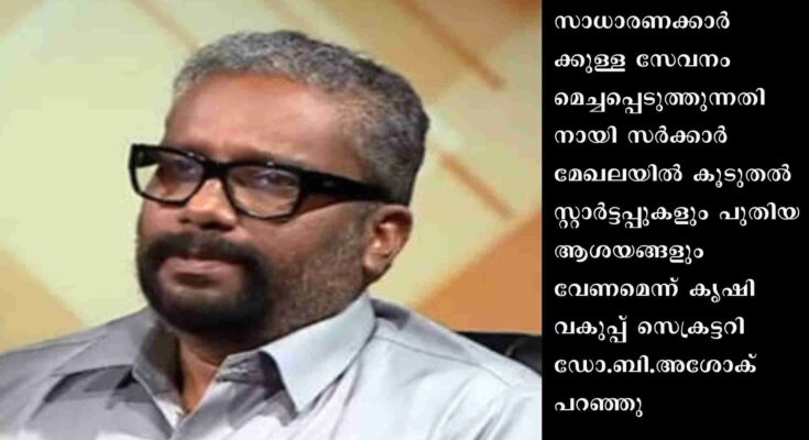 തിരുവനന്തപുരം:സാധാരണക്കാർക്കുള്ള സേവനം മെച്ചപ്പെടുത്തുന്നതിനായി സർക്കാർ മേഖലയിൽ കൂടുതൽ സ്റ്റാർട്ടപ്പുകളും പുതിയ ആശയങ്ങളും വേണമെന്ന് കൃഷിവകുപ്പ് സെക്രട്ടറി ഡോ.ബി.അശോക് പറഞ്ഞു. കോവളത്ത് ഹഡിൽ ഗ്ളോബൽ സംഗമത്തിൽ സംസാരിക്കുകയായിരുന്നു അദ്ദേഹം.