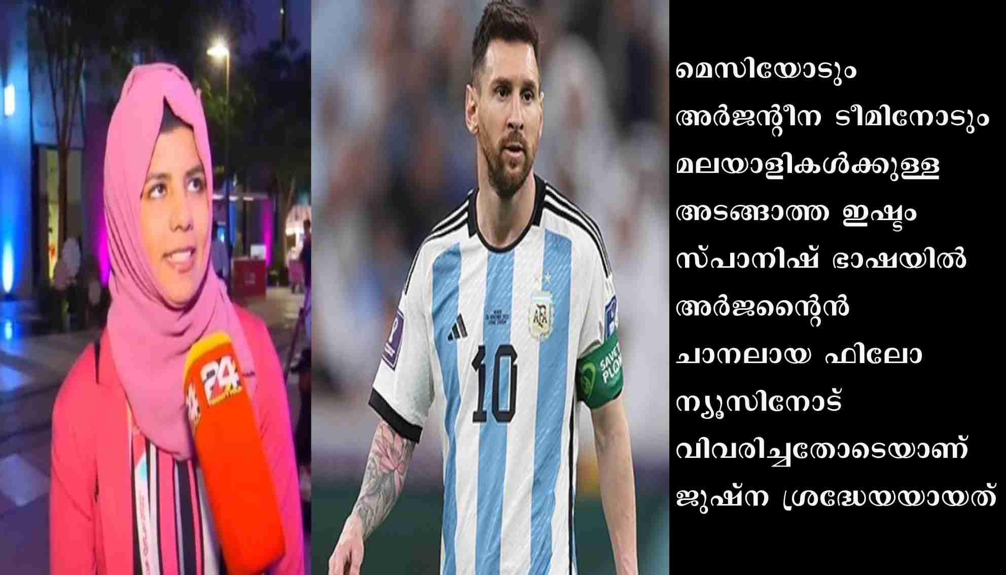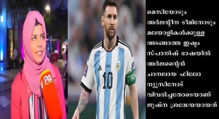 കണ്ണൂർ: കേരളത്തിലെ ഫുട്ബോൾ സ്നേഹത്തെ പറ്റി അർജന്റീനിയൻ മാധ്യമങ്ങൾക്ക് സ്പാനിഷിൽ വിവരിച്ച് നൽകി വൈറലായ ഒരു മലയാളിയുണ്ട് ഖത്തറിൽ. കണ്ണൂർ പാപ്പിനിശ്ശേരി സ്വദേശി ജുഷ്ന ഷാഹിനാണ് ആ മലയാളി. ലയണൽ മെസിയെ അഭിമുഖം നടത്താൻ വേണ്ടിയാണ് ജുഷ്ന സ്പാനിഷ് ഭാഷ പഠിച്ചത്.