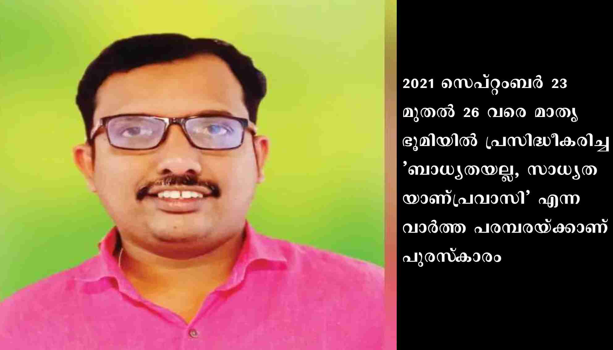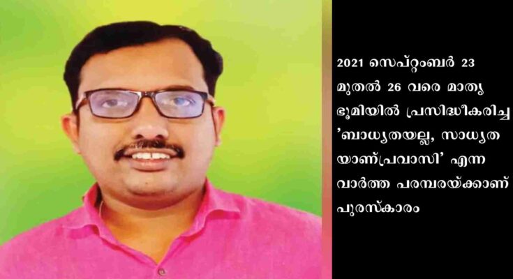 മുംബൈ: പത്രപ്രവർത്തന മികവിന് മുംബൈ പ്രസ് ക്ലബ്ബ് ഏർപ്പെടുത്തിയ ദേശീയ മാധ്യമ പുരസ്കാരം മാതൃഭൂമി കോഴിക്കോട് യൂണിറ്റിലെ സീനിയർ സബ് എഡിറ്റർ അനു എബ്രഹാമിന്. 2021 സെപ്റ്റംബർ 23 മുതൽ 26 വരെ മാതൃഭൂമിയിൽ പ്രസിദ്ധീകരിച്ച ‘ബാധ്യതയല്ല, സാധ്യതയാണ് പ്രവാസി’ എന്ന വാർത്ത പരമ്പരയ്ക്കാണ് പുരസ്കാരം.