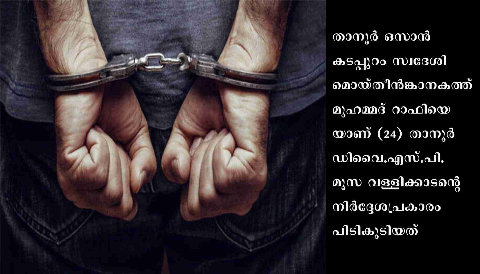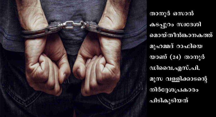 താനൂര്: വിവിധ പേരുകളില് പ്രത്യക്ഷപ്പെട്ട് സാമ്പത്തിക തട്ടിപ്പ് നടത്തിവന്നിരുന്ന യുവാവ് താനൂര് പോലീസിന്റെ പിടിയില്. താനൂര് ഒസാന് കടപ്പുറം സ്വദേശി മൊയ്തീന്ങ്കാനകത്ത് മുഹമ്മദ് റാഫിയെയാണ് (24) താനൂര് ഡിവൈ.എസ്.പി. മൂസ വള്ളിക്കാടന്റെ നിര്ദ്ദേശപ്രകാരം പിടികൂടിയത്. പോലീസ് വോളന്റിയര്, പോലീസ് സ്ക്വാഡ്, ട്രോമ കെയര് എന്നിവ ചമഞ്ഞു മലപ്പുറം, കോഴിക്കോട് ജില്ലകളില് വിവിധ ആളുകളില്നിന്നും കടകളില്നിന്നും പണം വാങ്ങിച്ചു തട്ടിപ്പ് നടത്തിവരുകയായിരുന്നു.