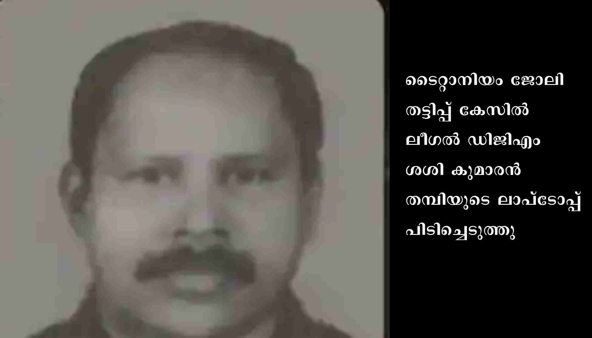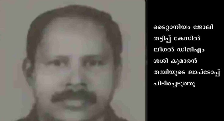 തിരുവനന്തപുരം: ടൈറ്റാനിയം ജോലി തട്ടിപ്പ് കേസിൽ ലീഗൽ ഡിജിഎം ശശി കുമാരൻ തമ്പിയുടെ ലാപ്ടോപ്പ് പിടിച്ചെടുത്തു. ജോലി തട്ടിപ്പിന്റെ വിവരങ്ങൾ ലാപ്ടോപ്പിൽ ഉണ്ടെന്നാണ് പൊലീസിന്റെ നിഗമനം. 2022 ഡിസംബർ 20ന് ഉച്ചതിരിഞ്ഞ് പൊലീസ് തുടങ്ങിയ പരിശോധന രാത്രി വരെ നീണ്ടു. ശശികുമാരൻ തമ്പി ഒളിവിലാണ്. ഇയാളെ കഴിഞ്ഞ ദിവസം സസ്പെന്റ് ചെയ്തിരുന്നു. ജോലി തട്ടിപ്പിന്റെ വിവരങ്ങൾ ലാപ്ടോപ്പിൽ ഉണ്ടെന്നാണ് പൊലീസിൻറെ നിഗമനം..