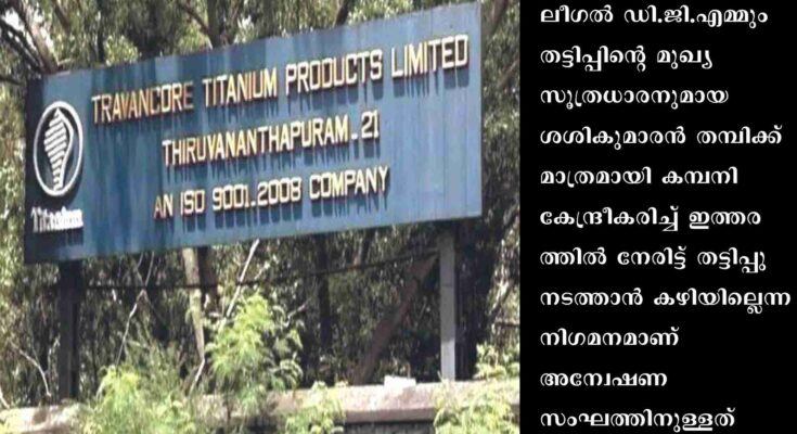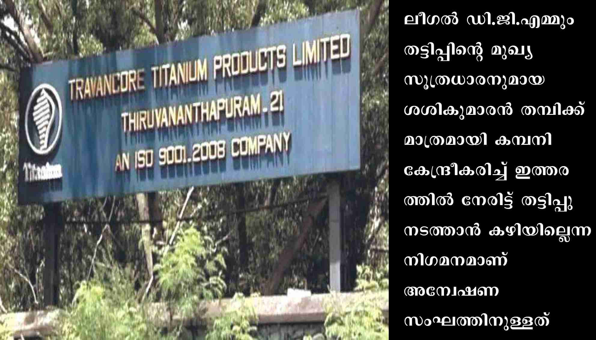തിരുവനന്തപുരം: ട്രാവൻകൂർ ടൈറ്റാനിയം ജോലി തട്ടിപ്പുകേസിൽ കമ്പനിയിലെ ഉന്നതരും . ലീഗൽ ഡി.ജി.എമ്മും തട്ടിപ്പിന്റെ മുഖ്യസൂത്രധാരനുമായ ശശികുമാരൻ തമ്പിക്കു മാത്രമായി കമ്പനി കേന്ദ്രീകരിച്ച് ഇത്തരത്തിൽ നേരിട്ട് തട്ടിപ്പുനടത്താൻ കഴിയില്ലെന്ന നിഗമനമാണ് അന്വേഷണ സംഘത്തിനുള്ളത്. അസി. കമ്മിഷണർ ദിനിലിന്റെ നേതൃത്വത്തിലുള്ള പ്രത്യേക അന്വേഷണ സംഘം കമ്പനിയിലെത്തി ഇത്തരം കാര്യങ്ങളിൽ വിശദമായ അന്വേഷണവും തെളിവുശേഖരണവും നടത്തും..