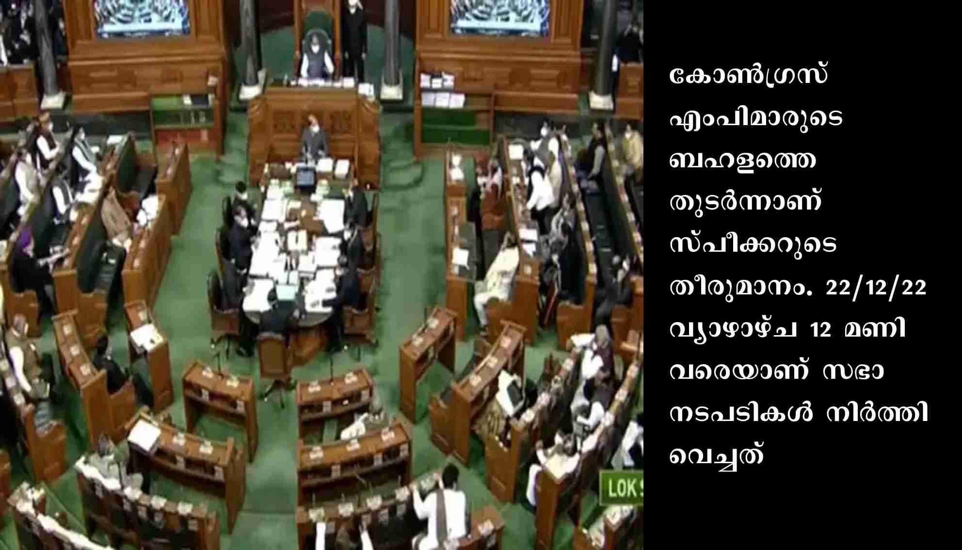ദില്ലി: ലോക്സഭയിൽ പ്രതിപക്ഷത്ത് നിന്നുള്ള ബഹളത്തെ തുടർന്ന് സഭാ നടപടികൾ നിർത്തിവെച്ചു. കോൺഗ്രസ് എംപിമാരുടെ ബഹളത്തെ തുടർന്നാണ് സ്പീക്കറുടെ തീരുമാനം. 22/12/22 വ്യാഴാഴ്ച 12 മണി വരെയാണ് സഭാ നടപടികൾ നിർത്തിവെച്ചത്.