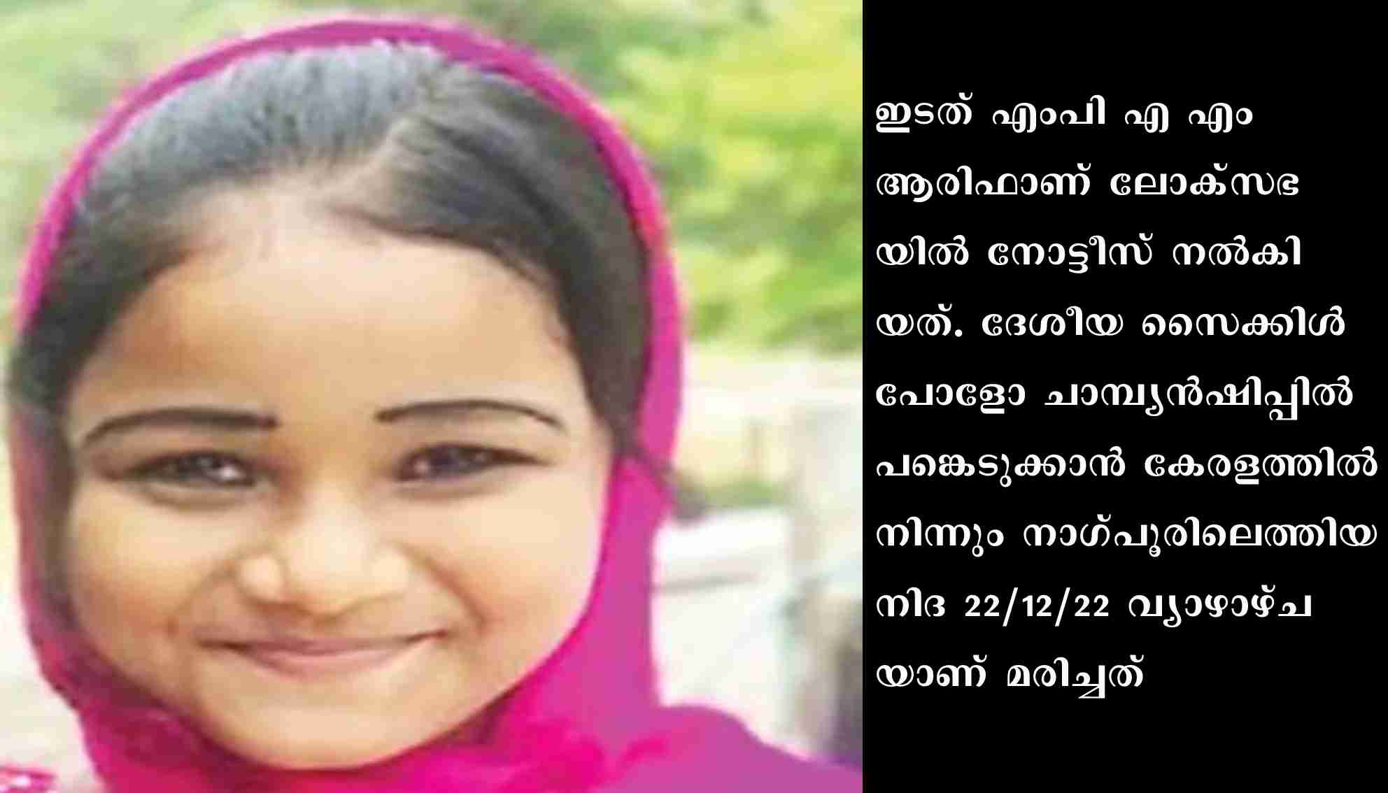 ദില്ലി : ദേശീയ സൈക്കിൾ പോളോ ചാമ്പ്യൻഷിപ്പിൽ പങ്കെടുക്കാൻ നാഗ്പൂരിലെത്തിയ കേരളാ താരം പത്ത് വയസുകാരി നിദ ഫാത്തിമയുടെ മരണവുമായി ബന്ധപ്പെട്ട് അന്വേഷണം ആവശ്യപ്പെട്ട് അടിയന്തര പ്രമേയത്തിന് നോട്ടീസ്. ഇടത് എംപി എ എം ആരിഫാണ് ലോക്സഭയിൽ നോട്ടീസ് നൽകിയത്. ദേശീയ സൈക്കിൾ പോളോ ചാമ്പ്യൻഷിപ്പിൽ പങ്കെടുക്കാൻ കേരളത്തിൽ നിന്നും നാഗ്പൂരിലെത്തിയ നിദ 22/12/22 വ്യാഴാഴ്ചയാണ് മരിച്ചത്.