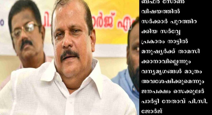 ഈരാറ്റുപേട്ട: ബഫർ സോൺ വിഷയത്തിൽ സർക്കാർ പുറത്തിറക്കിയ സർവ്വേ പ്രകാരം നാട്ടിൽ മനുഷ്യർക്ക് താമസിക്കാനാവില്ലെന്നും വന്യമൃഗങ്ങൾ മാത്രം അവശേഷിക്കുമെന്നും ജനപക്ഷം സെക്കുലർ പാർട്ടി നേതാവ് പി.സി. ജോർജ്. കാർബൺ ക്രെഡിറ്റ് ഫണ്ട് എന്നത് സമ്പന്നരാഷ്ട്രങ്ങളിലുള്ളവർക്ക് പാവങ്ങളെ പറ്റിക്കാനുള്ള ഒരു ഉപാധി മാത്രമാണെന്നും ഈ ഫണ്ട് വാങ്ങി കേരളത്തെ എന്തിനാണ് വനഭൂമിയാക്കി മാറ്റുന്നതെന്നും അദ്ദേഹം ചോദിച്ചു. കേരളത്തിലെ വനംവകുപ്പ് ഈ വർഷം മാത്രം 1000 കോടി രൂപ കാർബൺ ക്രെഡിറ്റ് ഫണ്ടായി വാങ്ങിയിട്ടുണ്ട് . ഇത് എന്തിനു വേണ്ടിയാണ് ചെലവഴിച്ചതെന്ന് ആർക്കും അറിയില്ല.