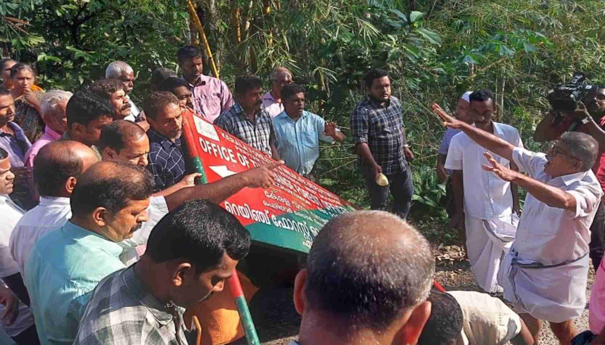 തുടർന്ന്, ഓഫീസിന്റെ മുന്നിൽ വച്ച് തന്നെ ബോർഡിൽ കരിഓയിൽ ഒഴിച്ച് പ്രതിഷേധിച്ചു. സർക്കാർ പുറത്തിറക്കിയ ഭൂപടത്തിൽ ഉൾപ്പെടുത്തിയ പ്രദേശം വനഭൂമിയിലാണെന്നാരോപിച്ചായിരുന്നു ജനകീയ പ്രതിഷേധം