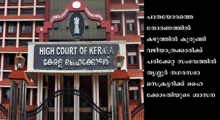 കൊച്ചി: പാതയോരത്തെ തോരണത്തിൽ കഴുത്തിൽ കുരുങ്ങി വഴിയാത്രക്കാരിക്ക് പരിക്കേറ്റ സംഭവത്തിൽ തൃശ്ശൂർ നഗരസഭാ സെക്രട്ടറിക്ക് ഹൈക്കോടതിയുടെ ശാസന. അപകടത്തിൽ സെക്രട്ടറി വിശദീകരണം നൽകണം. എന്തുകൊണ്ട് കേസിൽ എഫ്‌ഐആർ ഇട്ടില്ലെന്നും കോടതി ആരാഞ്ഞു.