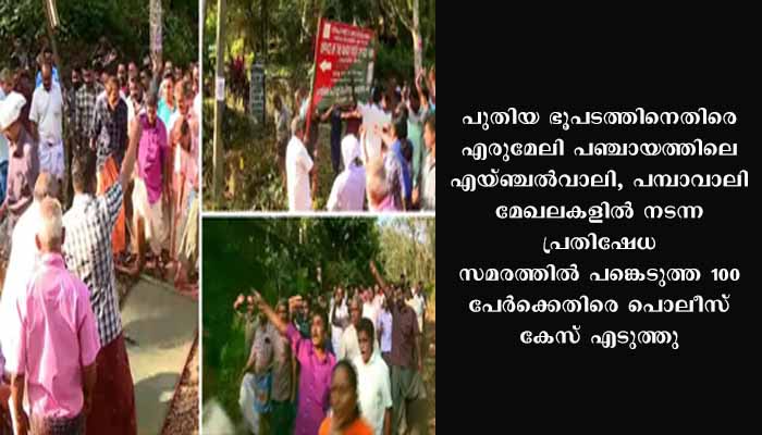 കോട്ടയം : ജനവാസ മേഖലകൾ വനമേഖലയെന്ന് രേഖപ്പെടുത്തി സർക്കാർ പ്രസിദ്ധീകരിച്ച പുതിയ ഭൂപടത്തിനെതിരെ എരുമേലി പഞ്ചായത്തിലെ എയ്ഞ്ചൽവാലി, പമ്പാവാലി മേഖലകളിൽ നടന്ന പ്രതിഷേധ സമരത്തിൽ പങ്കെടുത്ത 100 പേർക്കെതിരെ പൊലീസ് കേസ് എടുത്തു. വനംവകുപ്പിന്റെ പരാതിയിൽ 2 പഞ്ചായത്ത് അംഗങ്ങൾ ഉൾപ്പെടെയുള്ളവർക്കെതിരെയാണ് കേസ്. മറിയാമ്മ സണ്ണി, മാത്യു ജോസഫ് എന്നിവരാണ് മെമ്പർമാർ. മറ്റ് 98 പേർ കണ്ടാലറിയുന്നവരാണെന്നാണ് പൊലീസ് എഫ്ഐആറിൽ രേഖപ്പെടുത്തിയിട്ടുള്ളത്. പൊതു മുതൽ നശീകരണം ഉൾപ്പെടെ 8 വകുപ്പുകളാണ് പ്രതികൾക്കെതിരെ ചുമത്തിയത്. വനം വകുപ്പ് നൽകിയ പരാതിയിലാണ് പൊലീസ് കേസ്.