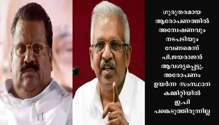 ആരോപണം സിപിഎം സംസ്ഥാന സെക്രട്ടറിയും പിബി അംഗവുമായ എം.വി ഗോവിന്ദൻ തള്ളിയില്ല. ആരോപണം എഴുതി നൽകാൻ പി ജയരാജന് നിർദ്ദേശം നൽകി. പരാതി രേഖാമൂലം കിട്ടിയാൽ പരിശോധിക്കാമെന്നും സെക്രട്ടറി സംസ്ഥാന കമ്മിറ്റിയിൽ വ്യക്തമാക്കി.