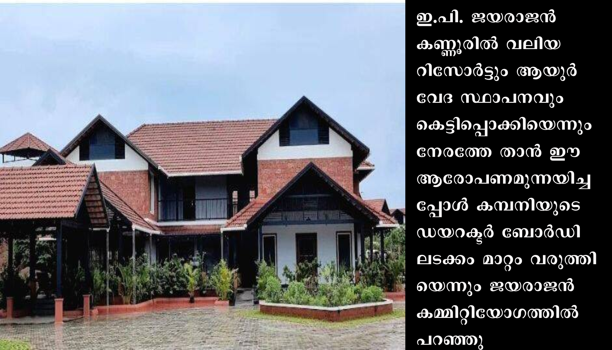 സി.പി.എം സംസ്ഥാന സെക്രട്ടറി എം.വി. ഗോവിന്ദന്റെ വീടിനടുത്ത് മൊറാഴയിലെ വെള്ളിക്കീലിലാണ് കമ്പനിയുടെ കീഴിലുള്ള വൈദേകം റിസോർട്ട്. 30കോടിയോളം ചെലവിട്ട് കുന്നിന്റെ മുകളിലാണ് നിർമ്മാണം.റവന്യു, ജിയോളജി, പഞ്ചായത്ത് വകുപ്പുകളുടെ അനുമതിയില്ലാതെയാണ് കുന്ന് ഇടിച്ചു നിരപ്പാക്കിയത്.`വ്യക്തിപരമായ ആക്ഷേപമല്ല, തെറ്റായ പ്രവണതകളുണ്ടാകുമ്പോൾ അത് ചർച്ചചെയ്യുന്ന കാര്യമാണ് തിരുത്തൽ രേഖാ ചർച്ചയിൽ ഉണ്ടായത്. റിസോർട്ടുമായി തനിക്ക് ബന്ധമില്ലെന്നറിയിച്ച് സി.പി.എം നേതൃത്വത്തിന് ഇ.പി. ജയരാജൻ കത്ത് നൽകിയതായി സൂചനയുണ്ട്.തലശ്ശേരിയിലെ രമേശ് കുമാർ എന്നയാളുമായി ബന്ധപ്പെട്ടതാണ് സ്ഥാപനമെന്നാണ് വിശദീകരണമെന്ന് അറിയുന്നു.