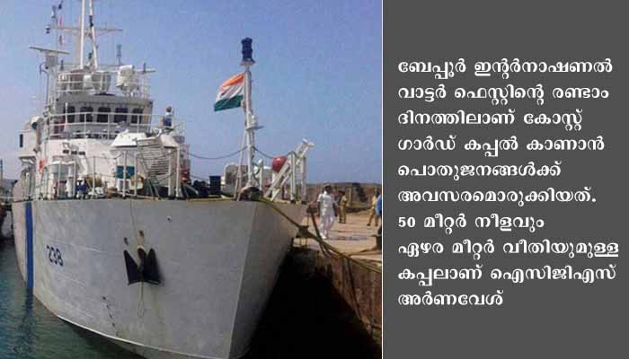 50 മീറ്റര് നീളവും ഏഴര മീറ്റര് വീതിയുമുള്ള കപ്പലാണ് ഐ സി ജി എസ് അര്ണവേശ്. കപ്പല് കാണാനെത്തുന്നവര്ക്ക് തീരദേശ സുരക്ഷയെക്കുറിച്ചും കോസ്റ്റ് ഗാര്ഡിന്റെ ദൗത്യങ്ങളെക്കുറിച്ചുമെല്ലാം കണ്ടും കേട്ടും മനസ്സിലാക്കാം. രാവിലെ 9 മണി മുതല് വൈകിട്ട് 4 മണി വരെയാണ് സന്ദര്ശന സമയം.