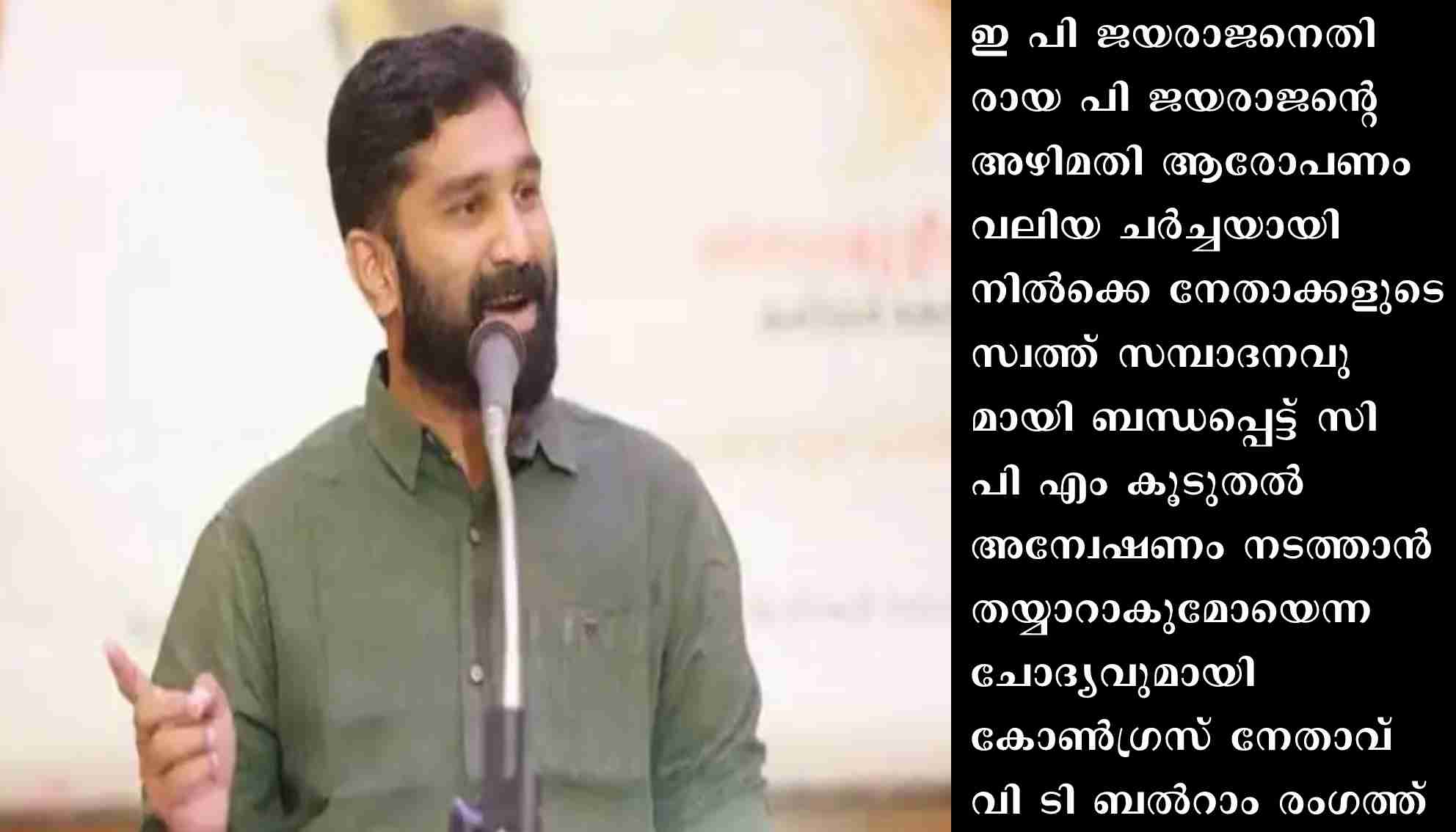 പാലക്കാട്: ഇ പി ജയരാജനെതിരായ പി ജയരാജന്റെ അഴിമതി ആരോപണം വലിയ ചർച്ചയായി നിൽക്കെ നേതാക്കളുടെ സ്വത്ത് സമ്പാദനവുമായി ബന്ധപ്പെട്ട് സി പി എം കൂടുതൽ അന്വേഷണം നടത്താൻ തയ്യാറാകുമോയെന്ന ചോദ്യവുമായി കോൺഗ്രസ് നേതാവ് വി ടി ബൽറാം രംഗത്ത്. പഴയ ടി വി അഭുമുഖത്തിലെ കാര്യങ്ങളെടുത്തുപറഞ്ഞുകൊണ്ട് ഒരു പ്രമുഖന്റെ മകൾ എന്ന് അഭിസംബോധന ചെയ്തുകൊണ്ടാണ് ബൽറാം രംഗത്തെത്തിയിരിക്കുന്നത്.