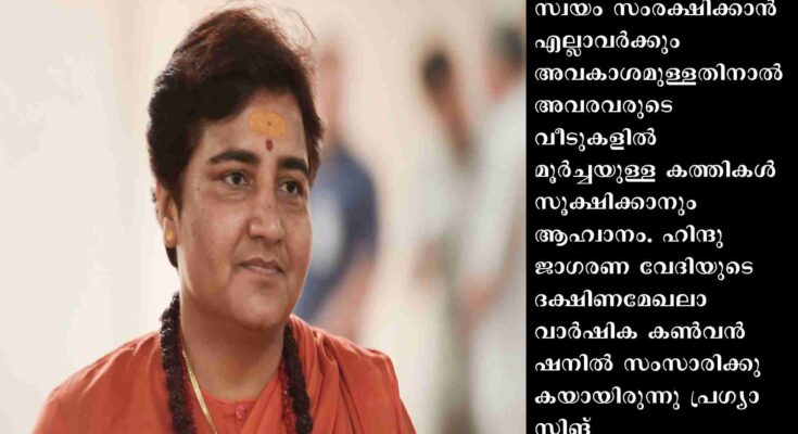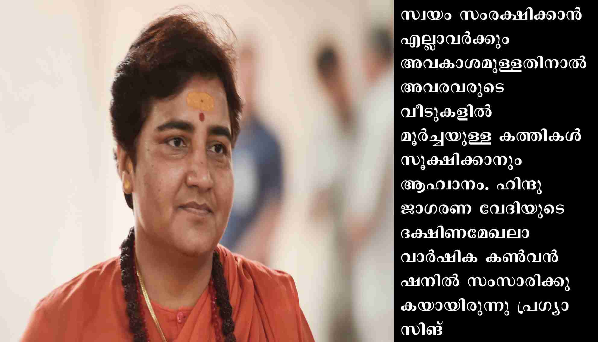 മധ്യപ്രദേശിലെ ഭോപ്പാല് പാര്ലമെന്റ് മണ്ഡലത്തെയാണ് പ്രഗ്യാ സിങ് താക്കൂര് പ്രതിനിധാനം ചെയ്യുന്നത്. ശിവമോഗയിലെ ഹര്ഷ ഉള്പ്പെടെയുള്ള ഹിന്ദു സംഘടനാ പ്രവര്ത്തകരുടെ കൊലപാതകം ചൂണ്ടിക്കാട്ടിയായിരുന്നു സ്വയം സംരക്ഷണത്തിനായി വീട്ടില് കത്തികള് സൂക്ഷിക്കാന് ആളുകളോടുള്ള അവരുടെ ആഹ്വാനം. ”െദെവത്താല് സൃഷ്ടിക്കപ്പെട്ട ഈ ലോകത്ത് എല്ലാ പീഡകരെയും പാപികളെയും അവസാനിപ്പിക്കുക. അല്ലെങ്കില് സ്നേഹത്തിന്റെ യഥാര്ഥ നിര്വചനം ഇവിടെ നിലനില്ക്കില്ല. അതിനാല് ലവ് ജിഹാദില് ഏര്പ്പെട്ടവര്ക്കും അതുപോലെ ഉത്തരം നല്കുക. നിങ്ങളുടെ പെണ്കുട്ടികളെ സംരക്ഷിക്കുക. ശരിയായ മൂല്യങ്ങള് അവരെ പഠിപ്പിക്കുക.നിങ്ങളുടെ വീടുകളില് ആയുധങ്ങള് സൂക്ഷിക്കുക. ഒന്നുമില്ലെങ്കില് പച്ചക്കറികള് മുറിക്കാനുപയോഗിച്ചിരുന്ന മൂര്ച്ചയുള്ള കത്തികളെങ്കിലും. എപ്പോള് എന്തു സാഹചര്യമുണ്ടാകുമെന്നറിയില്ല. സ്വയരക്ഷയ്ക്ക് എല്ലാവര്ക്കും അവകാശമുണ്ട്. ആരെങ്കിലും നമ്മുടെ വീട്ടിലേക്കു നുഴഞ്ഞുകയറി നമ്മെ ആക്രമിച്ചാല് ഉചിതമായ മറുപടി നല്കേണ്ടത് ഞങ്ങളുടെ അവകാശമാണ്.”