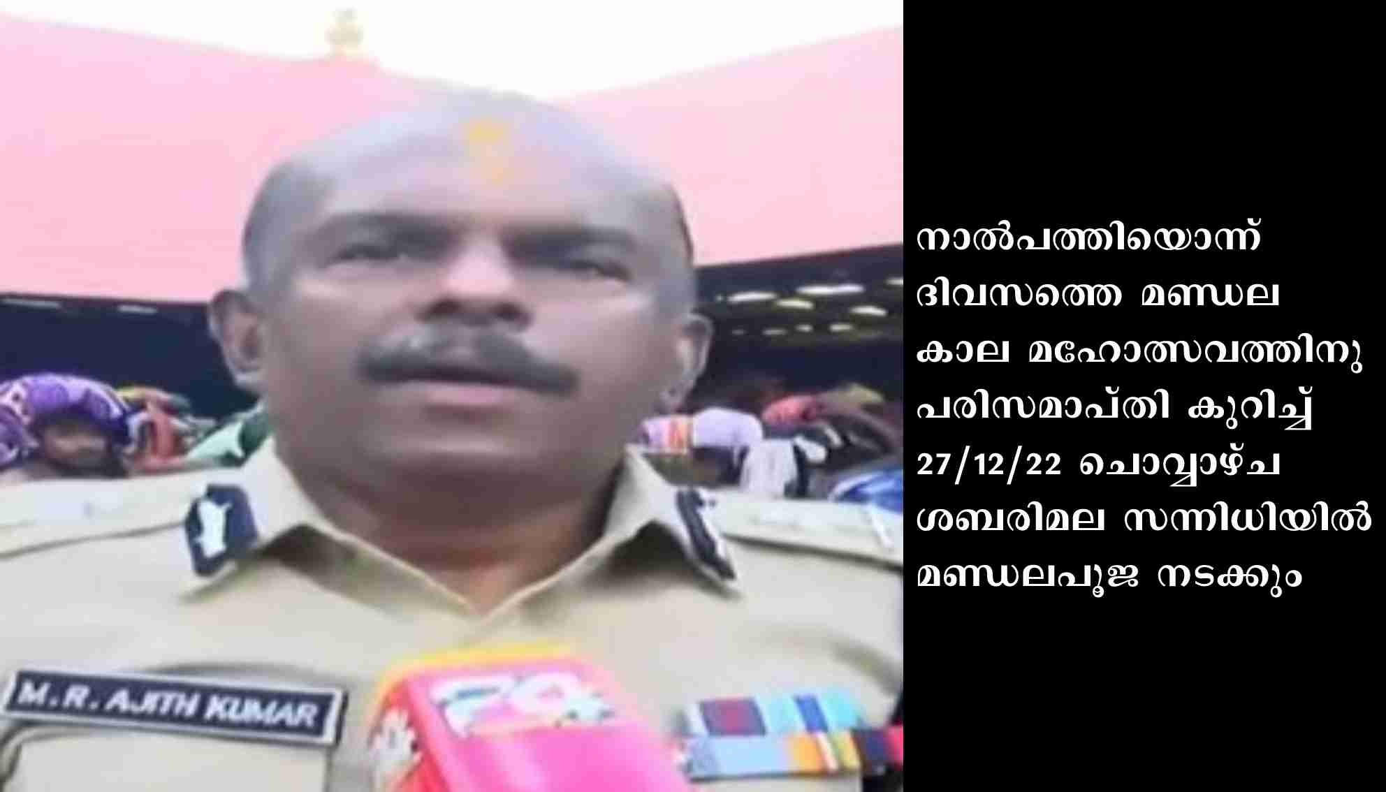നാൽപത്തിയൊന്ന് ദിവസത്തെ മണ്ഡലകാല മഹോത്സവത്തിനു പരിസമാപ്തി കുറിച്ച് 27/12/22 ചൊവ്വാഴ്ച ശബരിമല സന്നിധിയിൽ മണ്ഡലപൂജ നടക്കും. ഉച്ചയ്ക്ക് 12.30 നും ഒരു മണിക്കും മദ്ധ്യേ ആണ് മണ്ഡലപൂജ നടക്കുക. മണ്ഡലപൂജയ്ക്ക് ശേഷം ഭക്തർക്ക് ദർശനത്തിനു സൗകര്യം ഒരുങ്ങും. ഉച്ചയ്ക്ക് അടയ്ക്കുന്ന നട വൈകിട്ട് അഞ്ചു മണിക്ക് തുറക്കും.