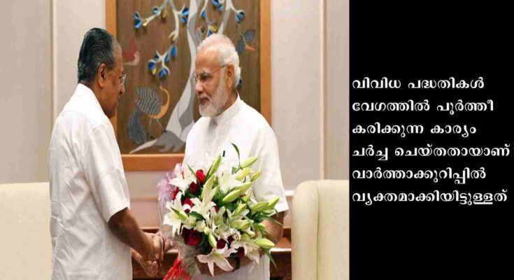ന്യൂഡല്‍ഹി: പ്രധാന മന്ത്രി നരേന്ദ്ര മോദിയും മുഖ്യമന്ത്രി പിണറായി വിജയനുമായുള്ള കൂടിക്കാഴ്ചയില്‍ ബഫര്‍ സോണ്‍ ചര്‍ച്ചയായില്ല. വിവിധ പദ്ധതികള്‍ വേഗത്തില്‍ പൂര്‍ത്തീകരിക്കുന്ന കാര്യം ചര്‍ച്ച ചെയ്തതായാണ് വാര്‍ത്താക്കുറിപ്പില്‍ വ്യക്തമാക്കിയിട്ടുള്ളത്. എന്നാല്‍, കെ റെയിലും വാര്‍ത്താക്കുറിപ്പില്‍ പരാമര്‍ശിച്ചിട്ടില്ല.ബഫര്‍ സോണ്‍, കെ-റെയില്‍ അടക്കമുള്ള വിഷയങ്ങള്‍ കൂടിക്കാഴ്ചയില്‍ ചര്‍ച്ചയാകുമെന്നായിരുന്നു പൊതുവെയുള്ള അനുമാനം.ബഫര്‍ സോണില്‍ ഉപഗ്രഹ സര്‍വേ ഉള്‍പ്പെടെയുള്ള നീക്കങ്ങള്‍ പിഴച്ച സാഹചര്യത്തില്‍ പ്രധാന മന്ത്രിയുമായുള്ള മുഖ്യമന്ത്രിയുടെ കൂടിക്കാഴ്ചക്ക് വലിയ പ്രാധാന്യമാണ് കല്‍പ്പിക്കപ്പെട്ടിരുന്നത്.