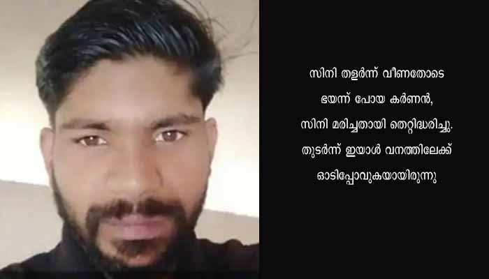 സിനി തളര്ന്ന് വീണതോടെ ഭയന്ന് പോയ കര്ണന്, സിനി മരിച്ചതായി തെറ്റിദ്ധരിച്ചു. തുടര്ന്ന് ഇയാള് വനത്തിലേക്ക് ഓടിപ്പോയി. ഇതിനിടെ വീട്ടിലെത്തിയ സിനിയുടെ ബന്ധുക്കള് സിനിയെ ആശുപത്രിയിലെത്തിച്ചു. തുടര്ന്ന് കര്ണ്ണന് വേണ്ടി നടത്തിയ അന്വേഷണത്തിനിടെയാണ് ഇയാള് വനത്തിനുള്ളിലെ കൂറ്റന് മരത്തില് തൂങ്ങി നില്ക്കുന്നതായി കണ്ടത്. ബന്ധുക്കളെത്തിയപ്പോഴേക്കും മരണം സംഭവിച്ചിരുന്നു. 9 മാസം ഗർഭിണിയാണ് സിനി. ഇവരുടെ ആദ്യത്തെ കുട്ടിയാണ് ഗര്ഭാവസ്ഥയിലുള്ളത്.