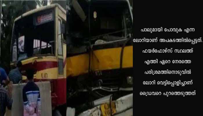 പാലുമായി പോവുകയായിരുന്ന ലോറിയാണ് അപകടത്തിൽപ്പെട്ടത്. ഫയർഫോഴ്സ് സ്ഥലത്ത് എത്തി ഏറെ നേരത്തെ പരിശ്രമത്തിനൊടുവിൽ ലോറി വെട്ടിപ്പൊളിച്ചാണ് ഡ്രൈവറെ പുറത്തെടുത്തത്. കെഎസ്ആർടിസി ബസിൽ ഉണ്ടായിരുന്നവരുടെ പരുക്ക് ഗുരുതരമല്ല. ഇവരെ വടകര ജില്ലാ ആശുപത്രിയിലേക്ക് മാറ്റി. കെഎസ്ആർടിസി ബസിന്റെ ഒരു ഭാഗം പൂർണമായും തകർന്നു.