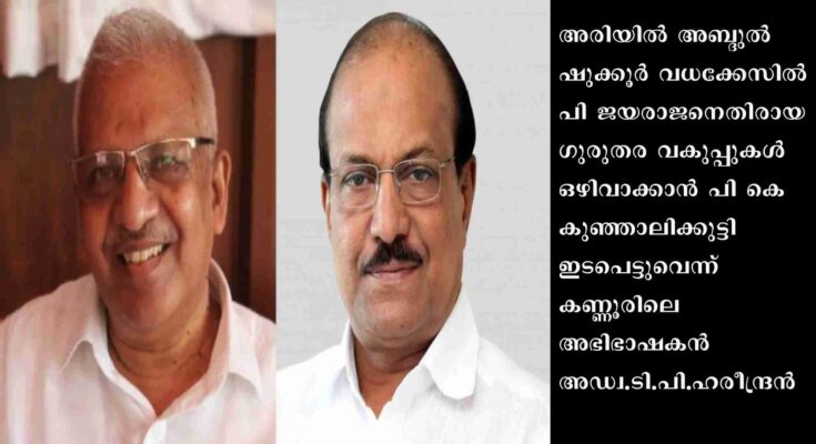 അരിയിൽ അബ്ദുൽ ഷുക്കൂർ വധക്കേസിൽ പി ജയരാജനെതിരായ ഗുരുതര വകുപ്പുകൾ ഒഴിവാക്കാൻ പി കെ കുഞ്ഞാലിക്കുട്ടി ഇടപെട്ടുവെന്ന് കണ്ണൂരിലെ അഭിഭാഷകൻ അഡ്വ.ടി.പി.ഹരീന്ദ്രൻ. . അന്നത്തെ കണ്ണൂർ ജില്ലാ പൊലീസ് മേധാവിയെ വിളിച്ച് ഇക്കാര്യം നിർദേശിച്ചുവെന്നും ഇക്കാര്യം അന്വേഷണ ഉദ്യോഗസ്ഥൻ തന്നോട് വെളിപ്പെടുത്തിയെന്നും അഭിഭാഷകൻ വ്യക്തമാക്കി.