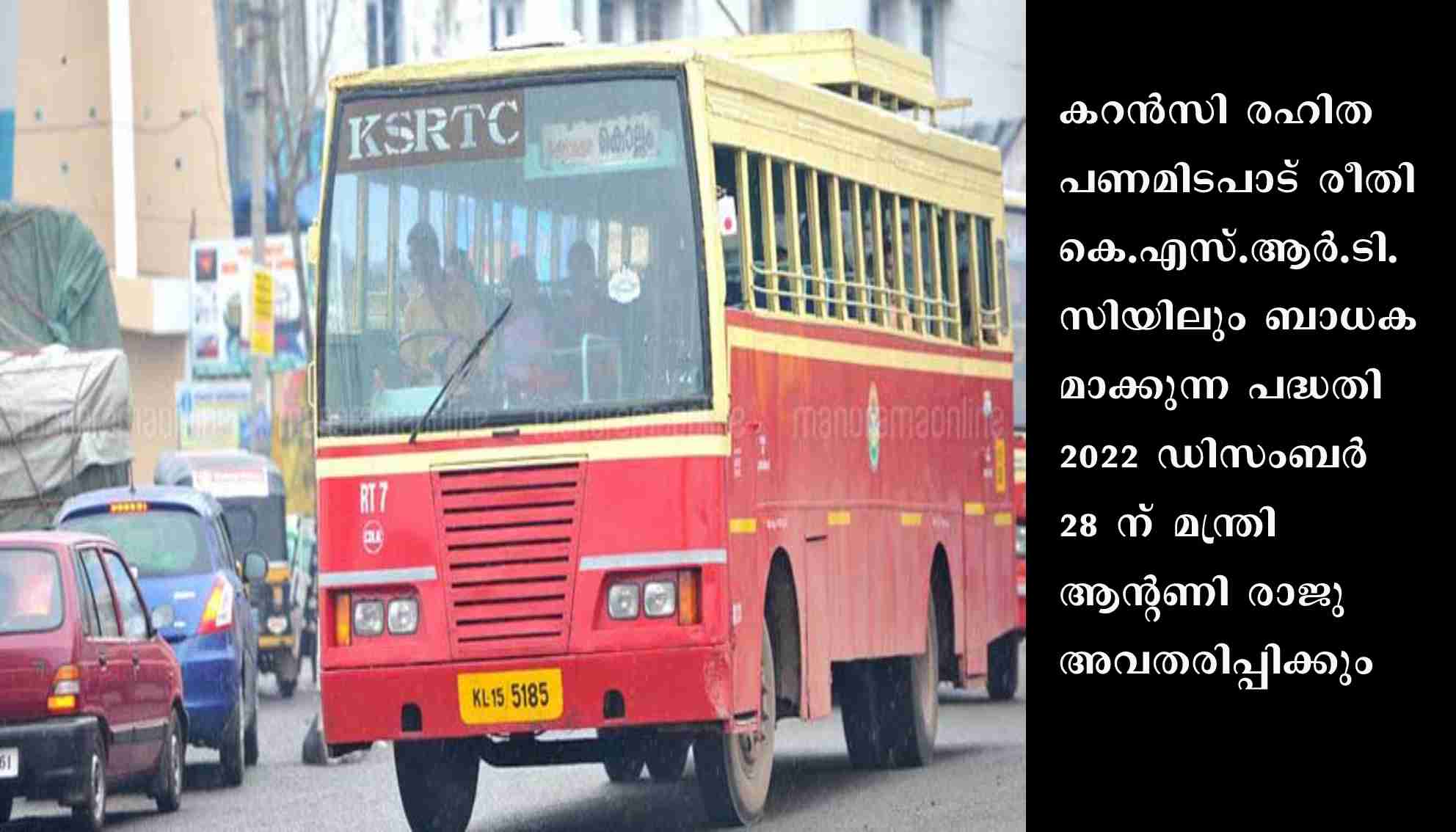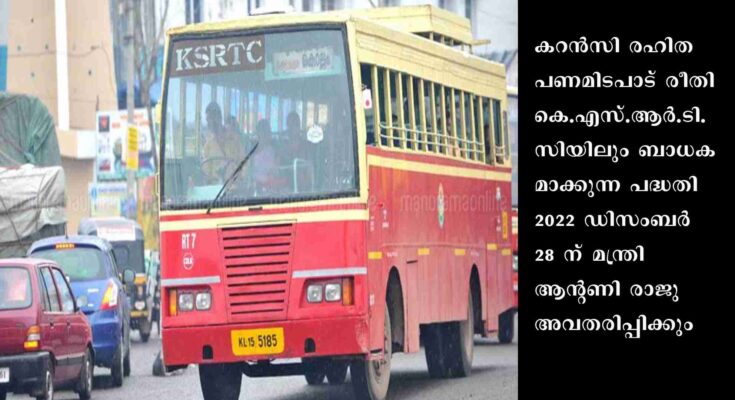 തിരുവനന്തപുരം: . മാറുന്ന കാലത്തിനനുസരിച്ചുള്ള പരിഷ്ക്കാരങ്ങൾ കെ.എസ്.ആർ.ടി.സി.യിലും നടപ്പിലാക്കുന്നു. കറൻസി രഹിത പണമിടപാട് രീതി കെ.എസ്.ആർ.ടി.സിയിലും ബാധകമാക്കുന്ന പദ്ധതി 2022 ഡിസംബർ 28 ന് മന്ത്രി ആന്റണി രാജു അവതരിപ്പിക്കും. ഇനിമുതൽ പണം കരുതാതെ ബസിൽ കയറാം, യാത്രാക്കൂലി കണ്ടക്ടർ പറയുമ്പോൾ മൊബൈൽ ഫോണിൽ ബസിൽ ഒട്ടിച്ചിരിക്കുന്ന ക്യു ആർ കോഡ് സ്കാൻ ചെയ്യുക, തുക ട്രാൻസ്ഫറായാൽ ടിക്കറ്റ് കൈയിൽ കിട്ടും. റിസർവേഷൻ കൗണ്ടറുകളിലും ക്യു.ആർ കോഡ് പതിക്കും.