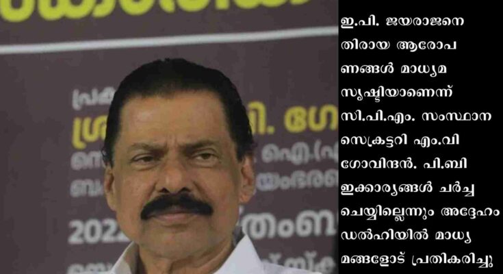 ന്യൂഡൽഹി: ഇ.പി. ജയരാജനെതിരായ ആരോപണങ്ങൾ മാധ്യമ സൃഷ്ടിയാണെന്ന് സി.പി.എം. സംസ്ഥാന സെക്രട്ടറി എം.വി ഗോവിന്ദൻ. പി.ബി ഇക്കാര്യങ്ങൾ ചർച്ചചെയ്യില്ലെന്നും അദ്ദേഹം ഡൽഹിയിൽ മാധ്യമങ്ങളോട് പ്രതികരിച്ചു.കേരളത്തിലെ വിഷയമടക്കം ചർച്ച ചെയ്യുമെന്ന് ജനറൽ സെക്രട്ടറി സീതാറാം യെച്ചൂരി സ്ഥിരീകരിച്ചതിന് പിന്നാലെയാണ് സംസ്ഥാന സെക്രട്ടറി വിഷയത്തിൽ ആദ്യമായി പ്രതികരണം നടത്തിയിട്ടുള്ളത്. പി. ജയരാജന്റെ ആരോപണം മാധ്യമങ്ങളും പ്രതിപക്ഷവും ഏറ്റെടുത്തതിന് പിന്നാലെയാണ് പാർട്ടിയുടെ തന്ത്രപരമായ ചുവടുമാറ്റം എന്നതും ശ്രദ്ധേയമാണ്.