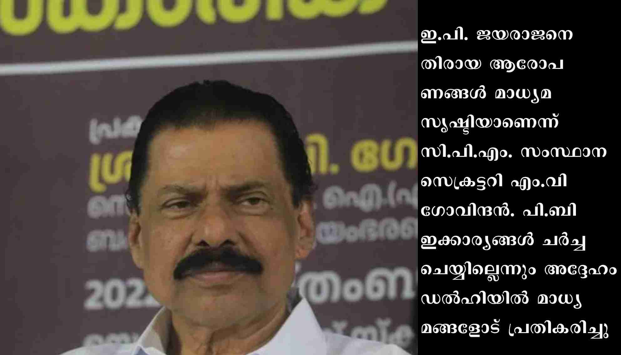 ന്യൂഡൽഹി: ഇ.പി. ജയരാജനെതിരായ ആരോപണങ്ങൾ മാധ്യമ സൃഷ്ടിയാണെന്ന് സി.പി.എം. സംസ്ഥാന സെക്രട്ടറി എം.വി ഗോവിന്ദൻ. പി.ബി ഇക്കാര്യങ്ങൾ ചർച്ചചെയ്യില്ലെന്നും അദ്ദേഹം ഡൽഹിയിൽ മാധ്യമങ്ങളോട് പ്രതികരിച്ചു.കേരളത്തിലെ വിഷയമടക്കം ചർച്ച ചെയ്യുമെന്ന് ജനറൽ സെക്രട്ടറി സീതാറാം യെച്ചൂരി സ്ഥിരീകരിച്ചതിന് പിന്നാലെയാണ് സംസ്ഥാന സെക്രട്ടറി വിഷയത്തിൽ ആദ്യമായി പ്രതികരണം നടത്തിയിട്ടുള്ളത്. പി. ജയരാജന്റെ ആരോപണം മാധ്യമങ്ങളും പ്രതിപക്ഷവും ഏറ്റെടുത്തതിന് പിന്നാലെയാണ് പാർട്ടിയുടെ തന്ത്രപരമായ ചുവടുമാറ്റം എന്നതും ശ്രദ്ധേയമാണ്.